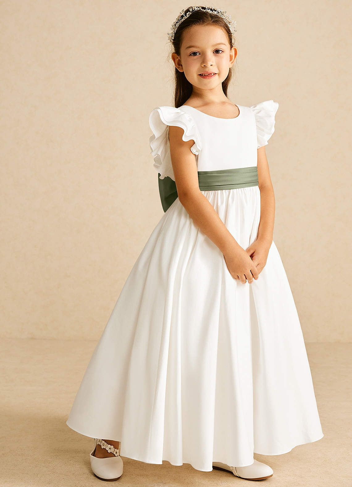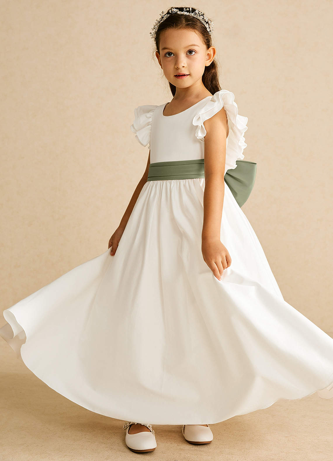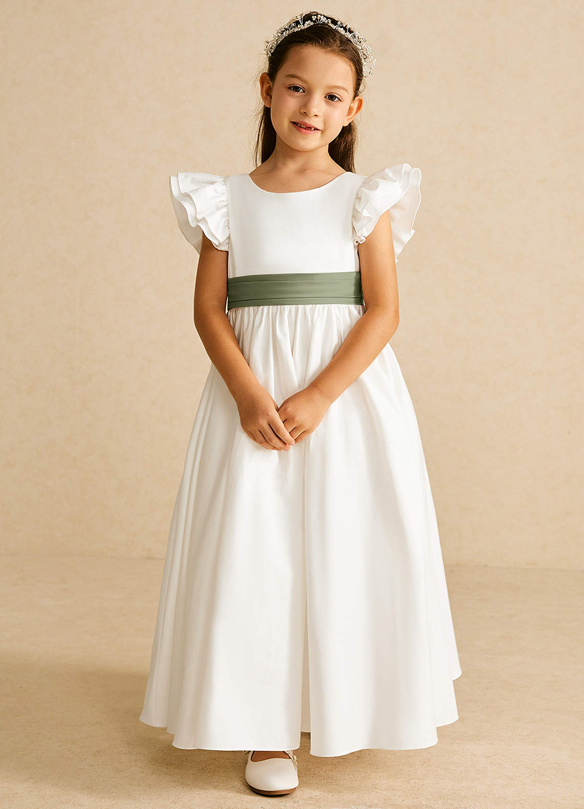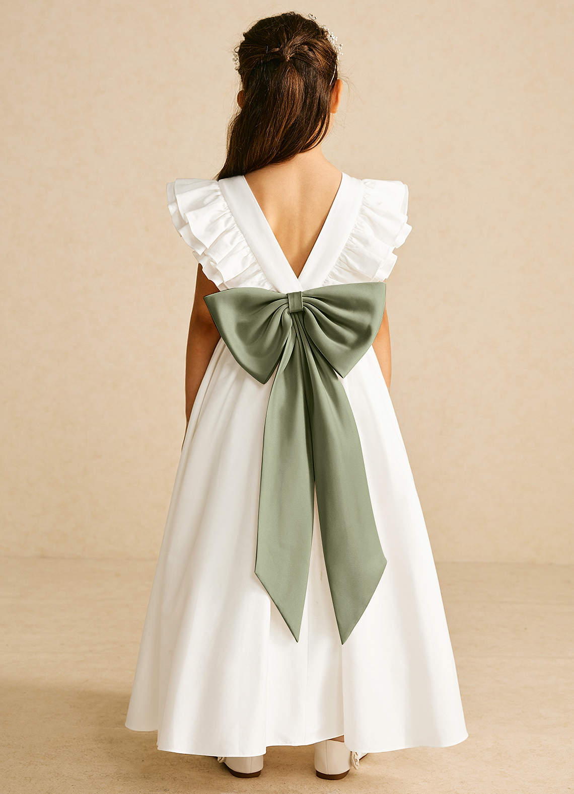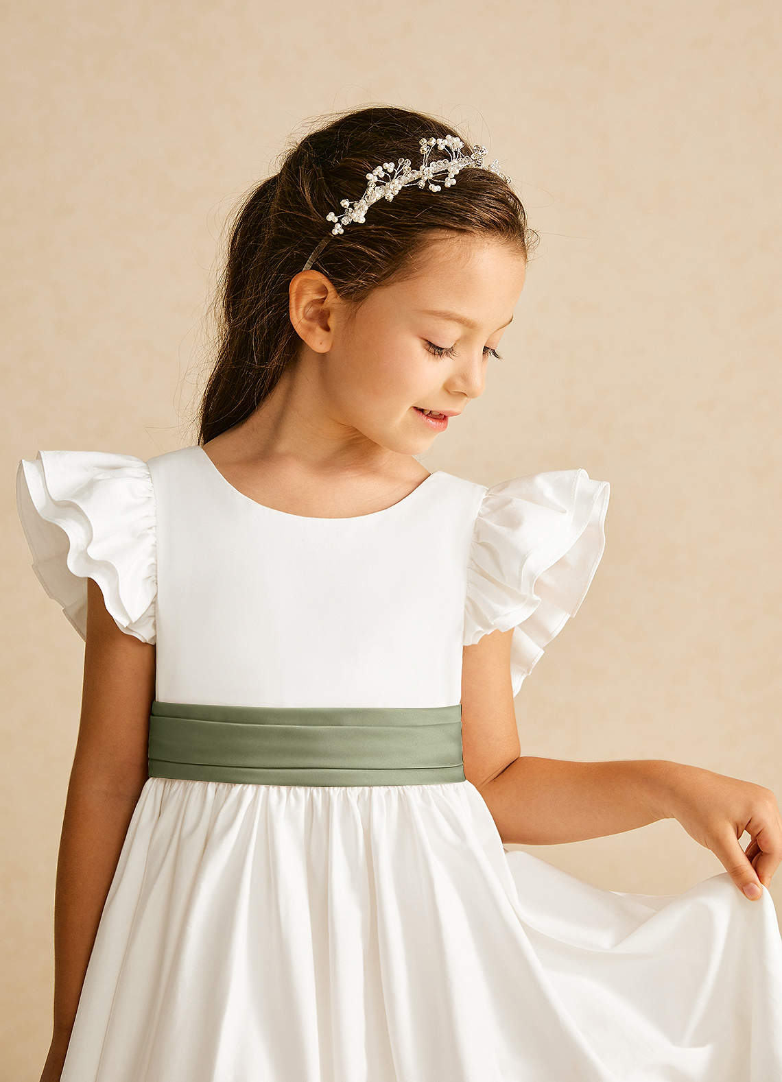 Let your flower girl have fun walking down the aisle while tossing petals in our matte satin dress, Aero. She features a scoop neckline, a beautiful V-back, a lovely bow tie belt, a ruched A-line skirt, and adorable flutter sleeves. This dress is not only perfect for a flower girl at a wedding but also versatile enough for other special occasions.
