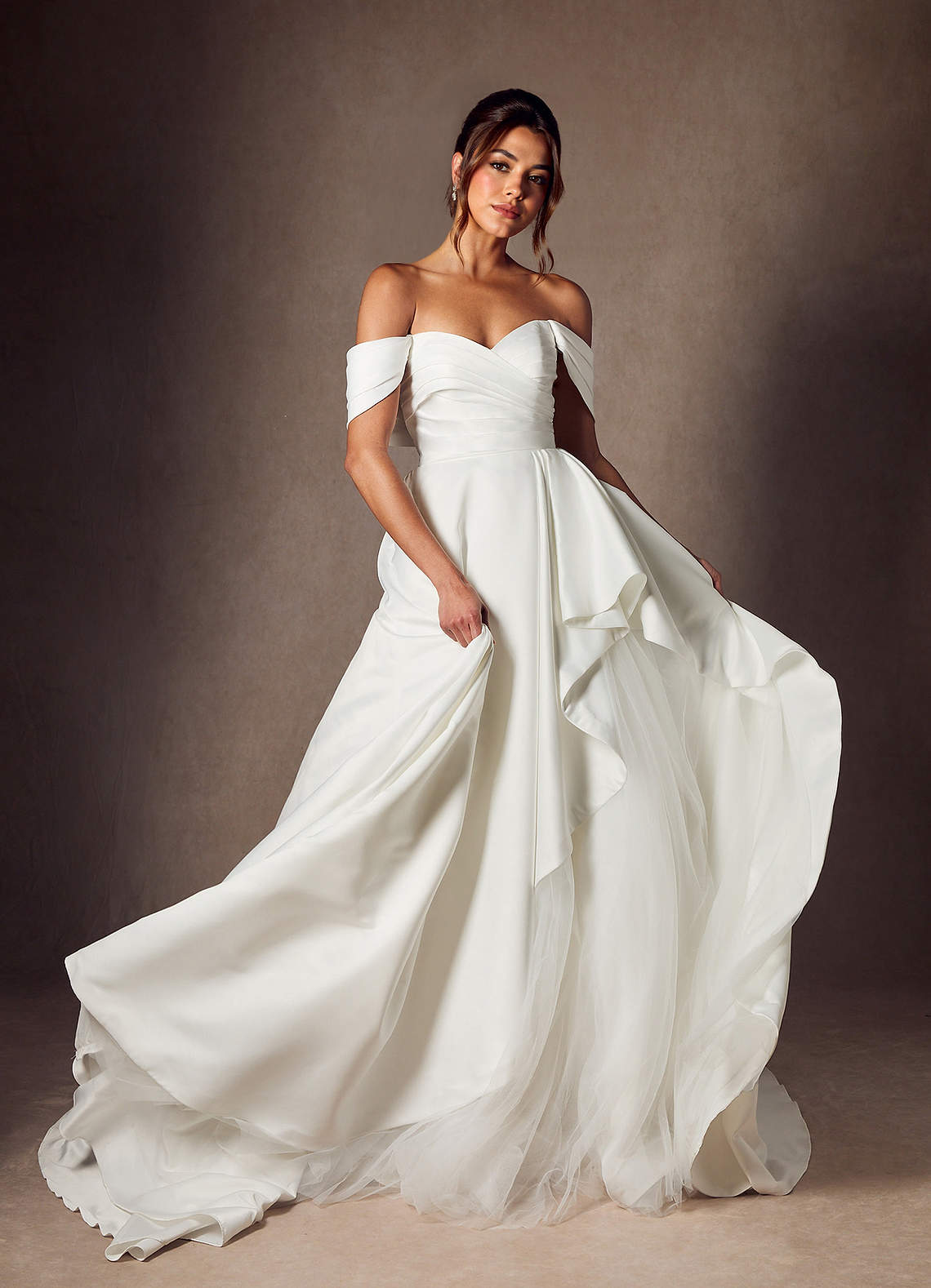 Make a statement on your special day wearing our Alexandria A-line gown. This stunning matte satin and tulle style combines a romantic sweetheart neckline, off-shoulder sleeves, and a gorgeous A-line skirt with pockets featuring a cascading ruffle detail and finished with a chapel train.