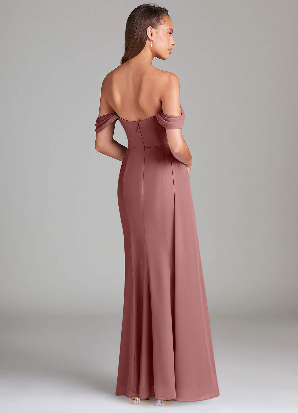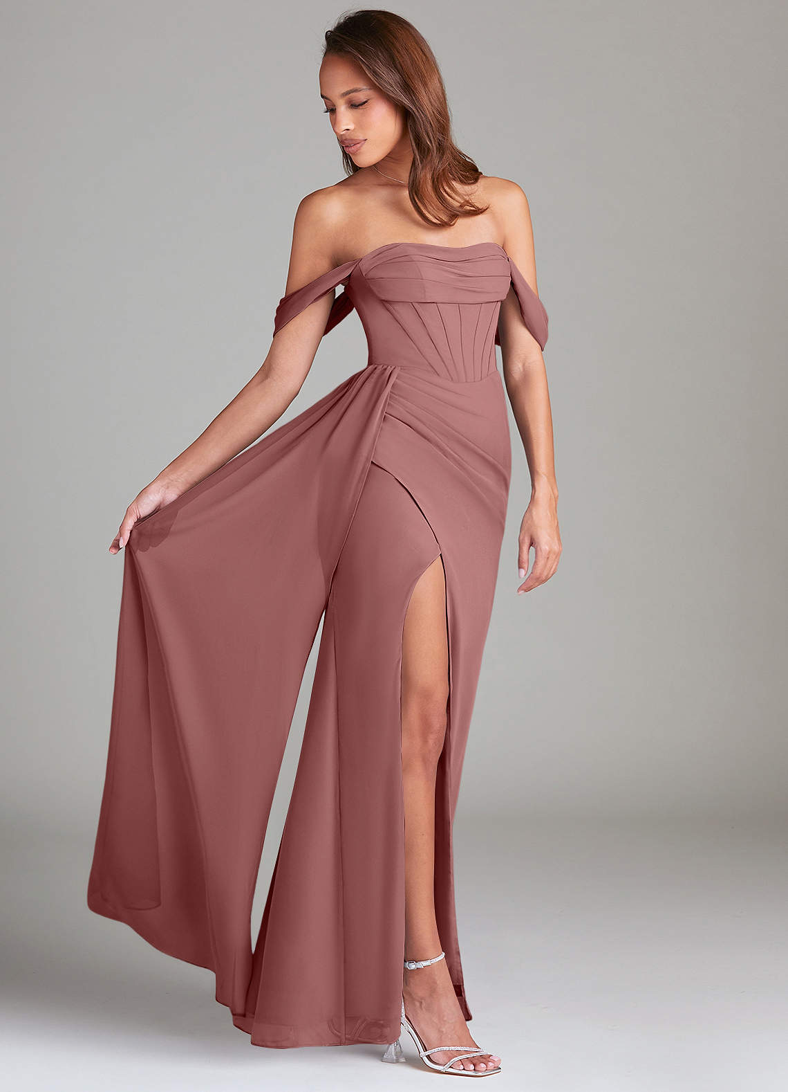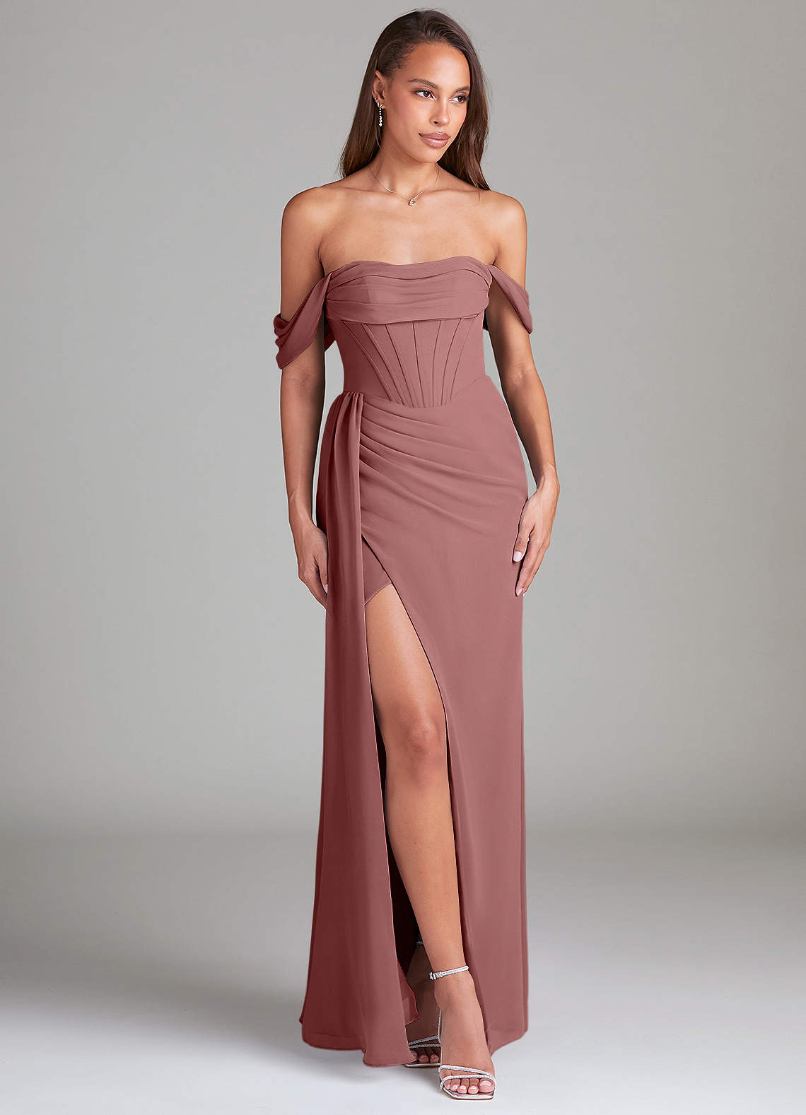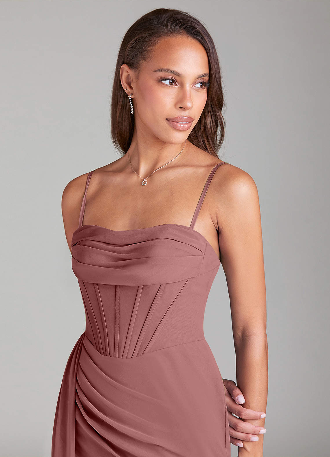 Amyra est destinée à toutes les demoiselles d'honneur qui souhaitent avoir la possibilité de transformer leur robe en apportant de légères modifications. Confectionnée en mousseline, son décolleté sans bretelles est complété par un corsage corset qui cintre magnifiquement la taille. Les manches drapées à épaules dénudées peuvent être retirées pour rendre cette robe sans bretelles. Sa jupe sirène est plissée et possède une fente au niveau des jambes qui est cachée par une ceinture latérale. Des bretelles spaghetti amovibles sont incluses pour offrir un ajustement plus sûr si nécessaire.