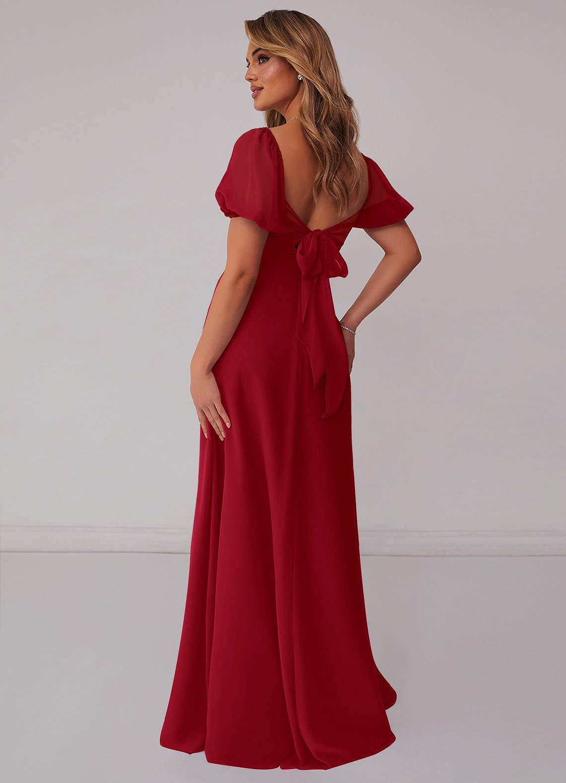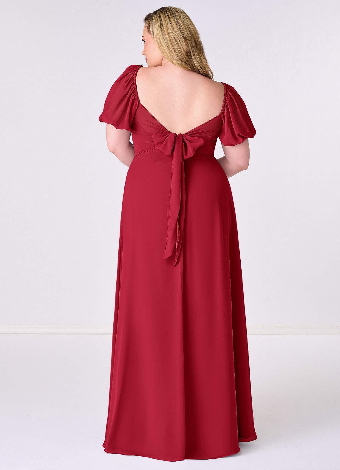 This floor length dress features a pleated V-neckline, puff sleeves, scoop back, and an illusion bow tie back.