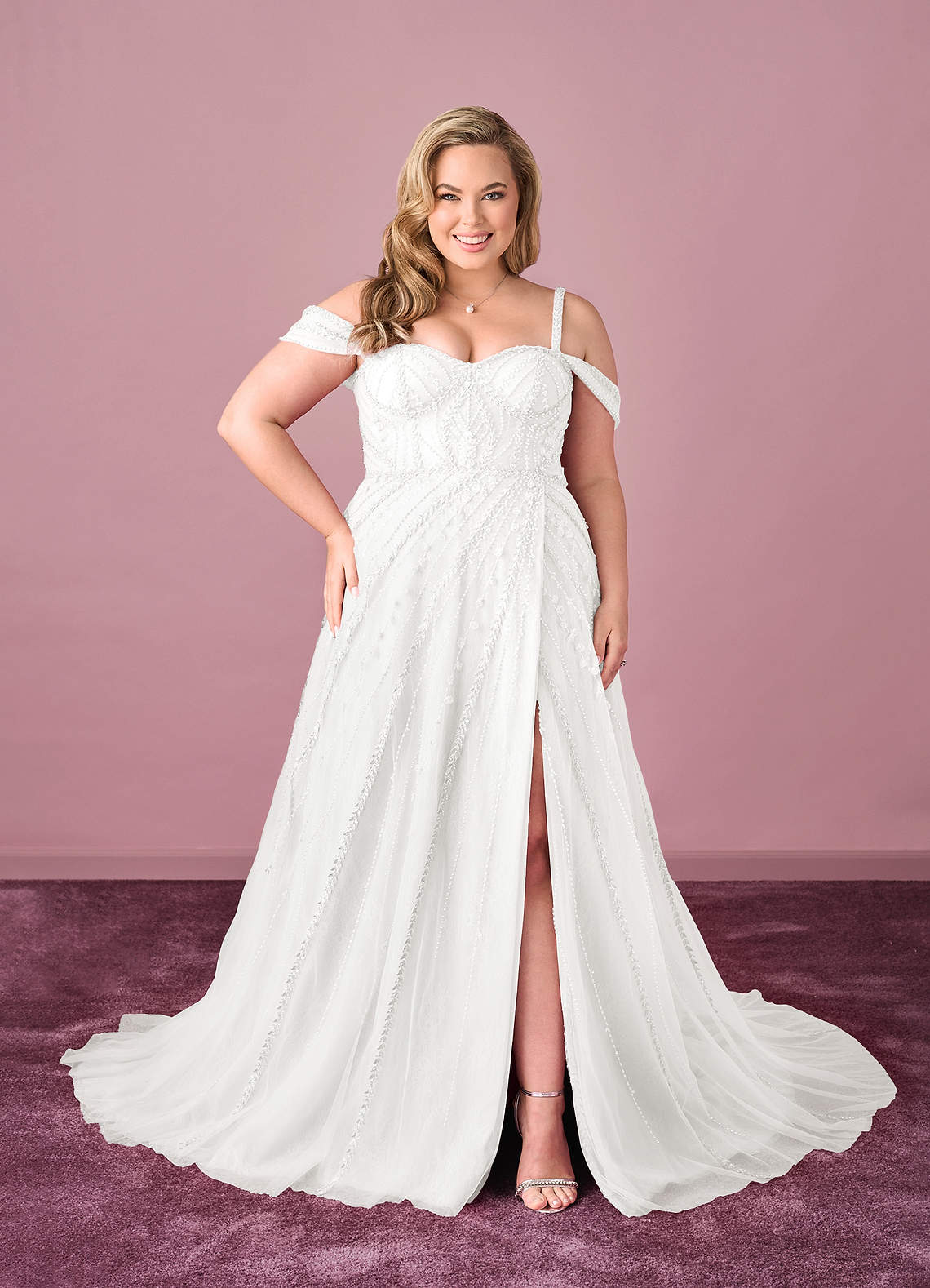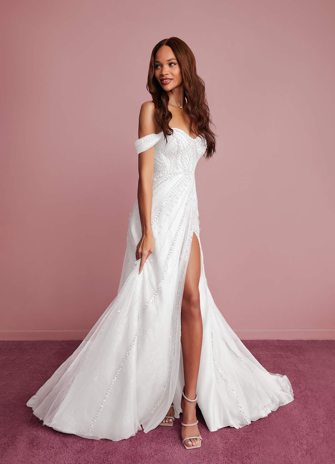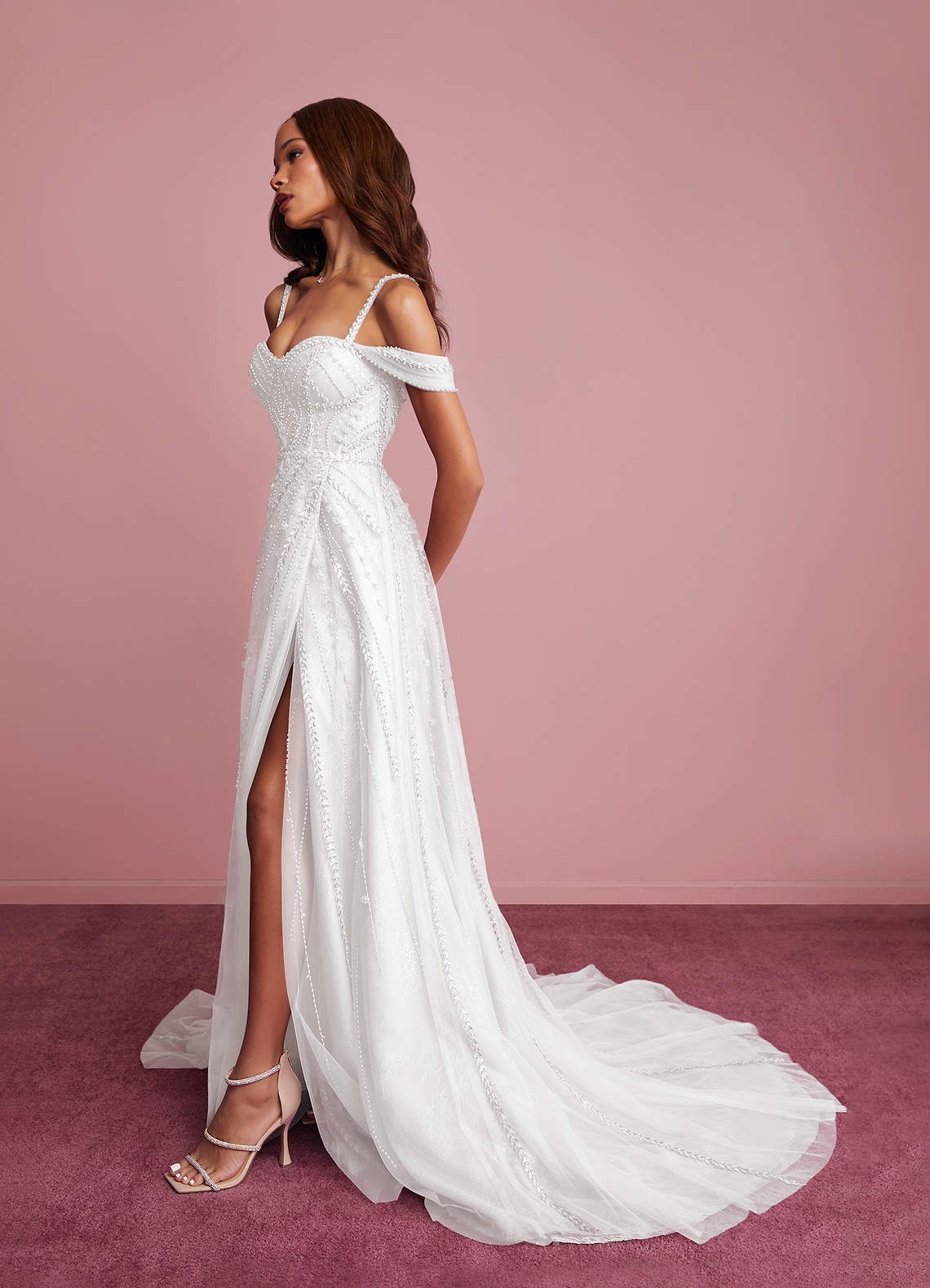 This chapel train gown features a sweetheart neckline, off-shoulder sleeves, a leg slit, and an all-over hand-beaded motif.