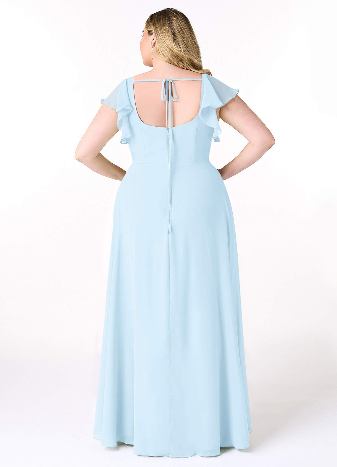 Bondi is our gorgeous bridesmaid dress cut from chiffon. She features a square neckline with flutter sleeves and a self tie scoop back. The look is complete with an A-line skirt paired with a leg slit.