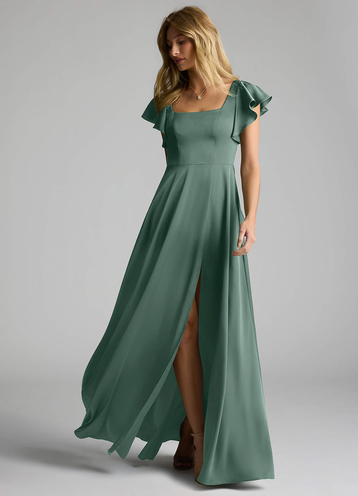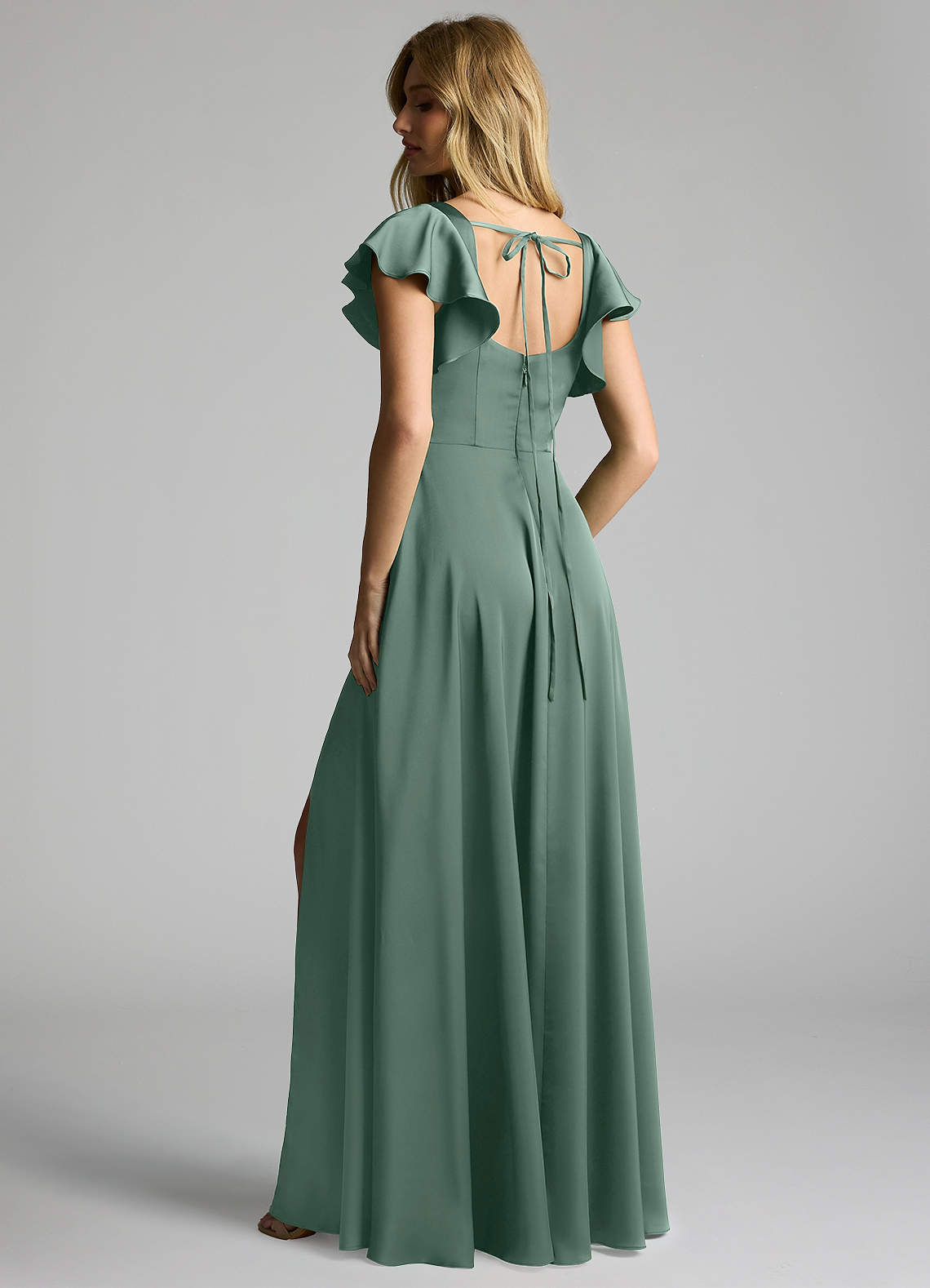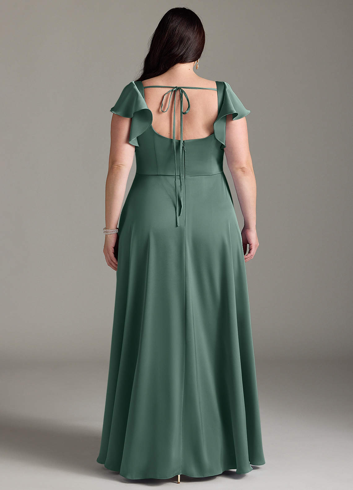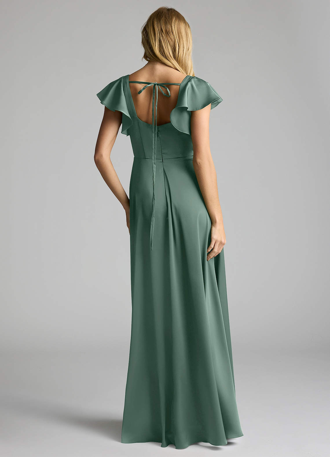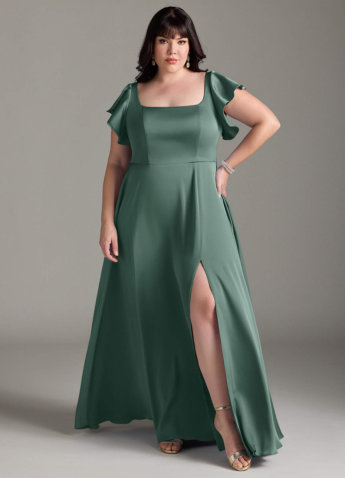 Bondi is our gorgeous bridesmaid dress cut from stretch satin. She features a square neckline with flutter sleeves and a self tie scoop back. The look is complete with an A-line skirt paired with a leg slit.