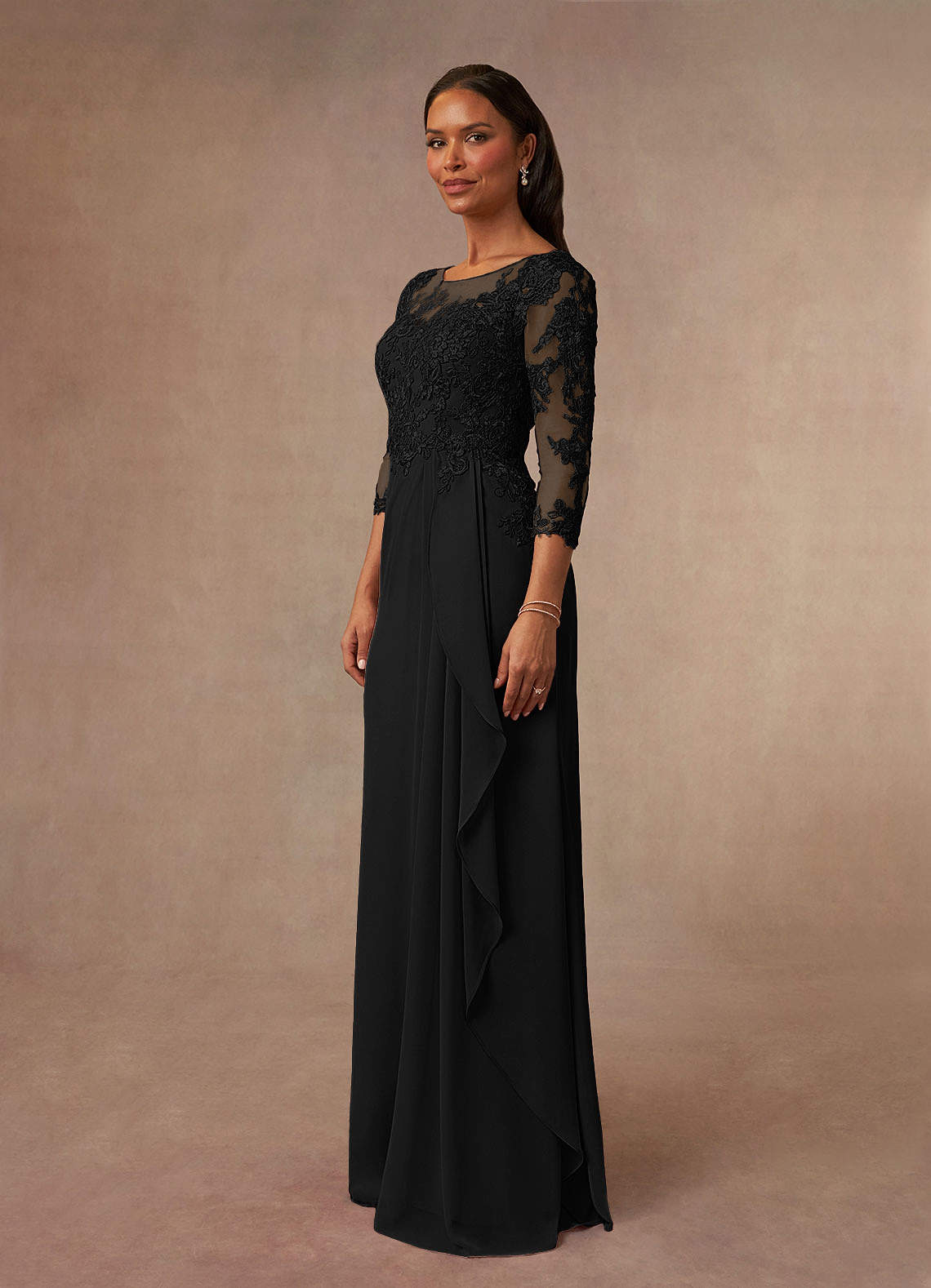 Calanthe is our elegant dress crafted from chiffon and tulle. She features an illusion scoop neckline with an inner sweetheart embellished with lace applique. The look is complete with a floor length sheath skirt.