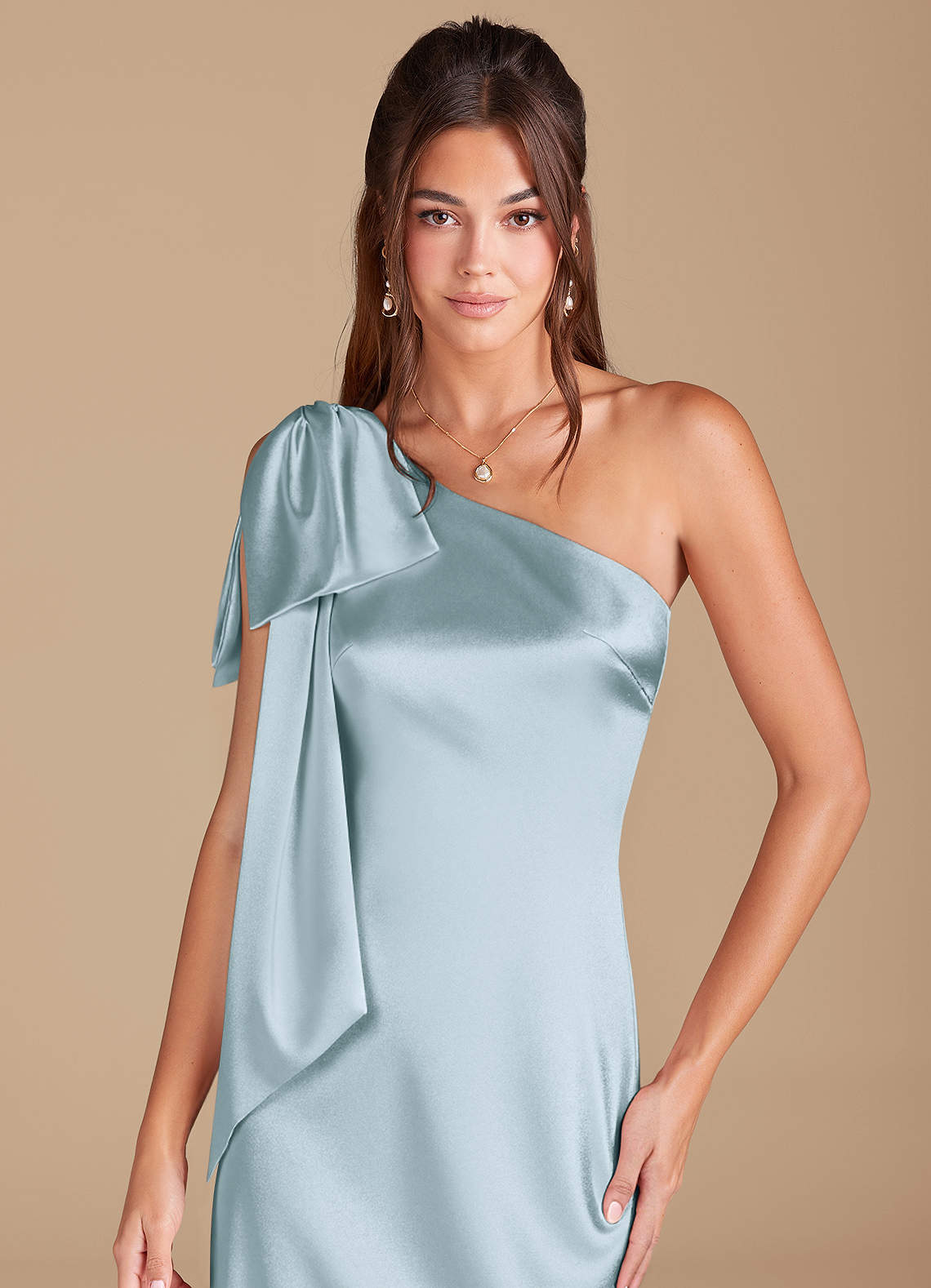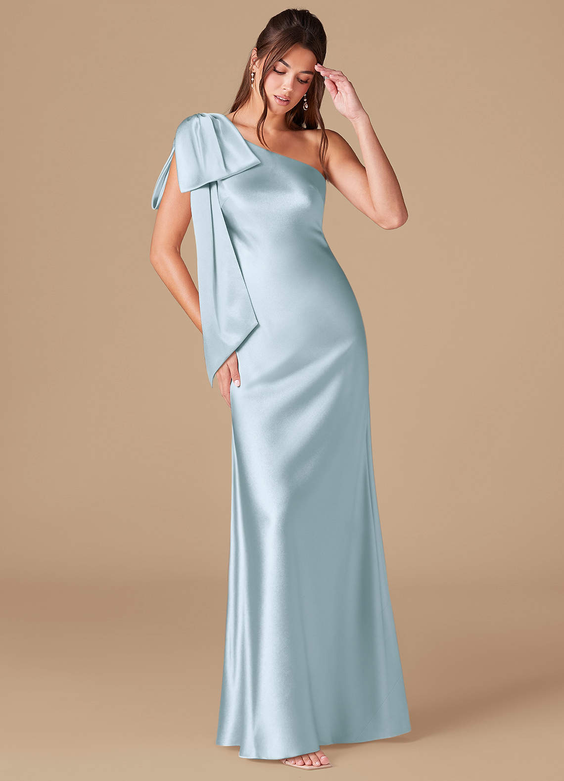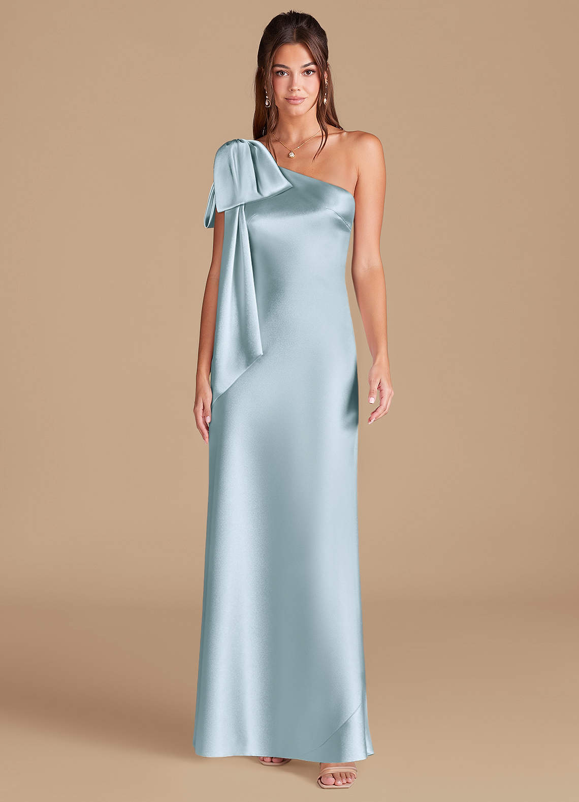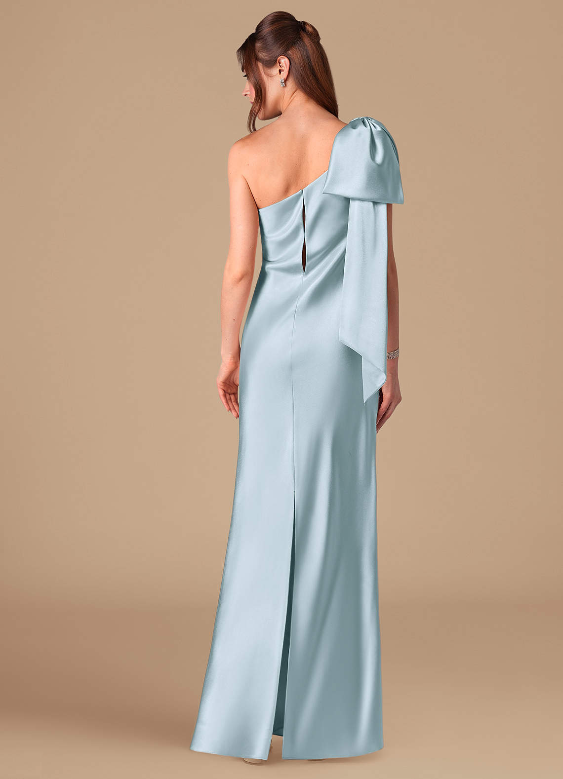 The Capri bridesmaid dress is a show-stopping metallic satin masterpiece, featuring a sleek floor-length sheath silhouette and a stunning one-shoulder design. A dramatic bow atop the shoulder and a daring back slit add a touch of elegance and modern flair to this unforgettable gown.
