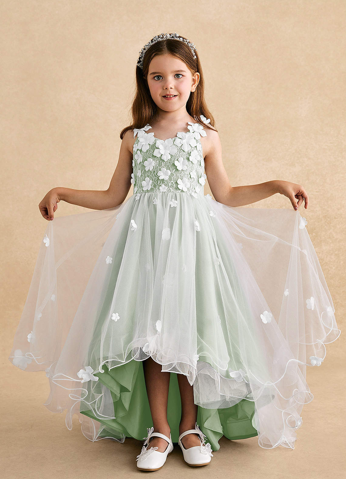 Let your little one shine in the Celia dress, where playful charm meets elegant design. The dress boasts a captivating asymmetrical silhouette with a knee-length front and cathedral-length back, complemented by a sleeveless V-neckline. Adorned with 3D flowers and a lovely bow at the back, its tulle over lace bodice and A-line skirt promise a magical look for any flower girl. This dress is not only perfect for a flower girl at a wedding but also versatile enough for other special occasions.