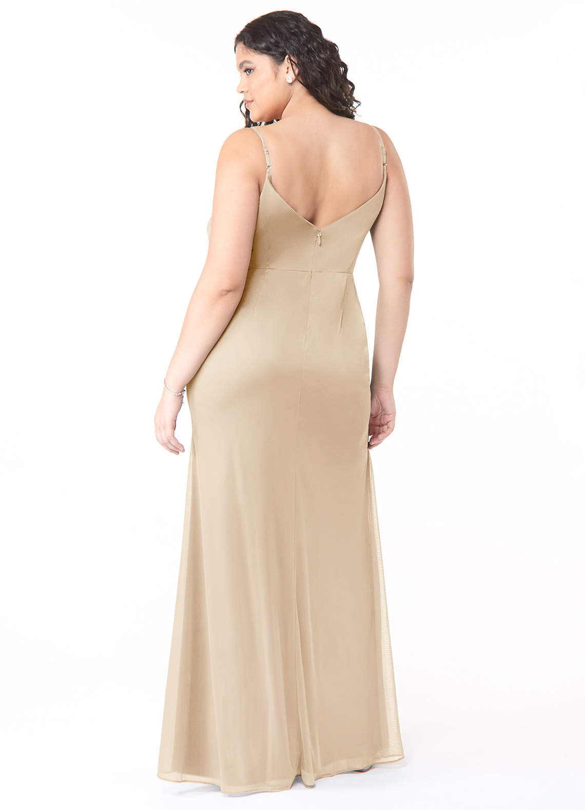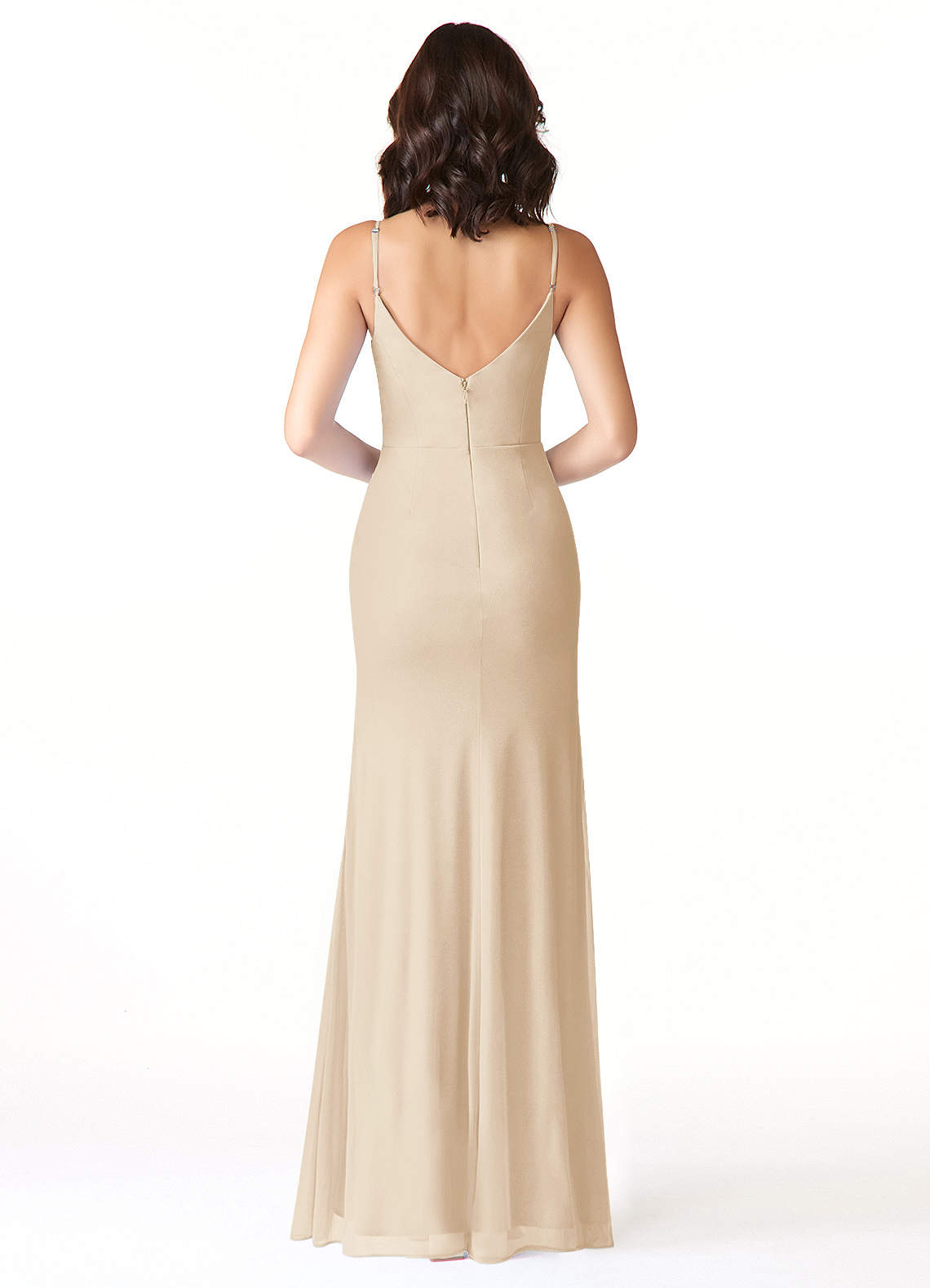 Deandra is a stunning bridesmaid dress cut from luxe stretch mesh. She features a front cowl neck and a V-back with adjustable spaghetti straps. The pleated mermaid bridesmaid dress comes with a leg slit and back darts for perfect fit.