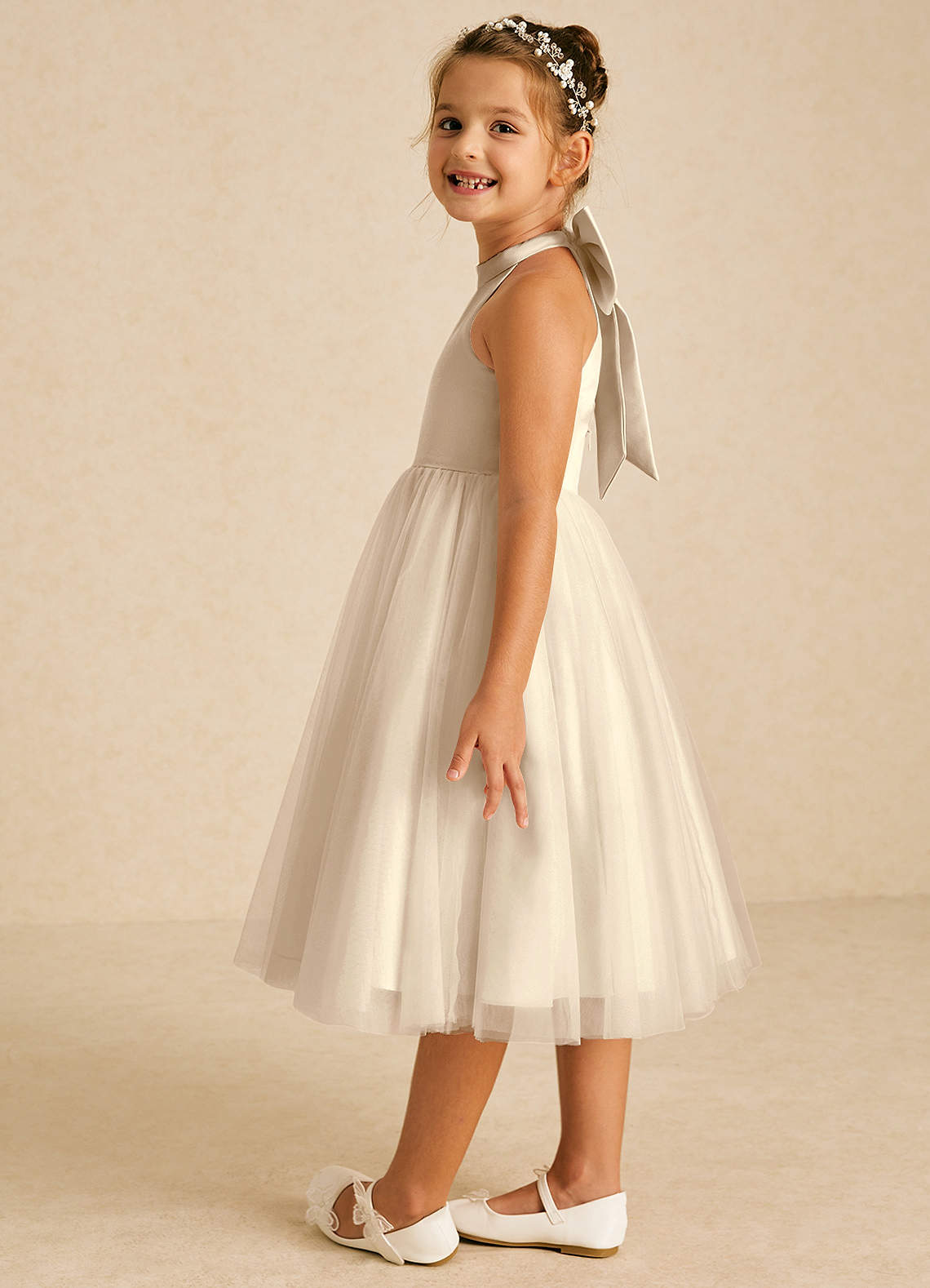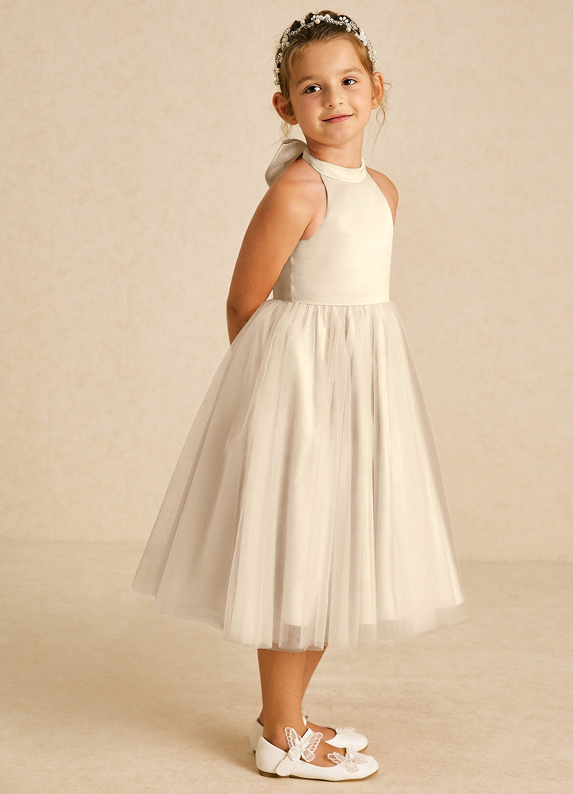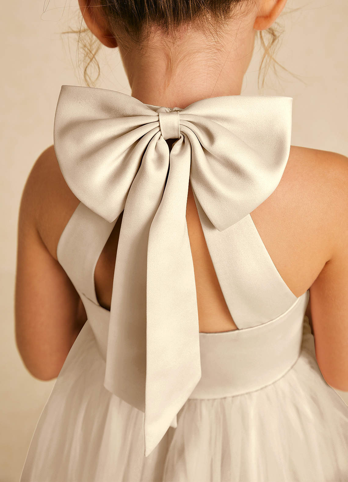 Dora features a charming A-line silhouette in matte satin and tulle, with a stylish halter neckline and playful bows. Sleeveless and easy to wear with a zipper back, it’s perfect for adding a touch of elegance to any special occasion.