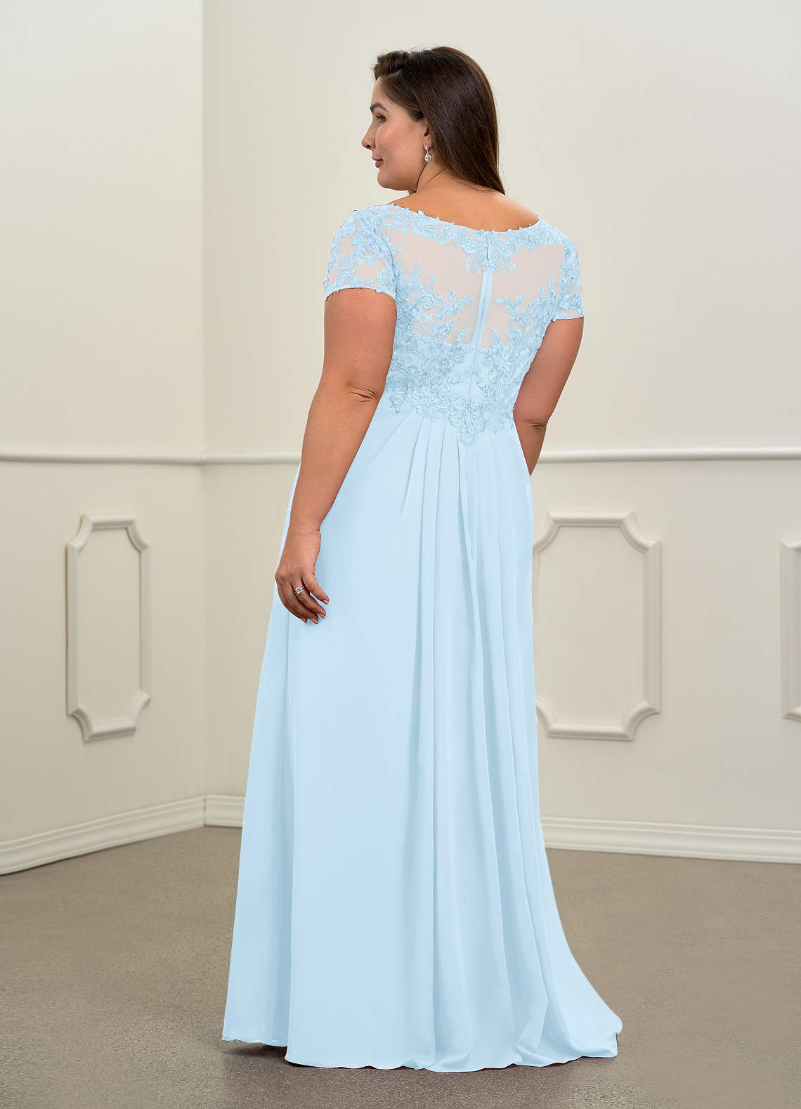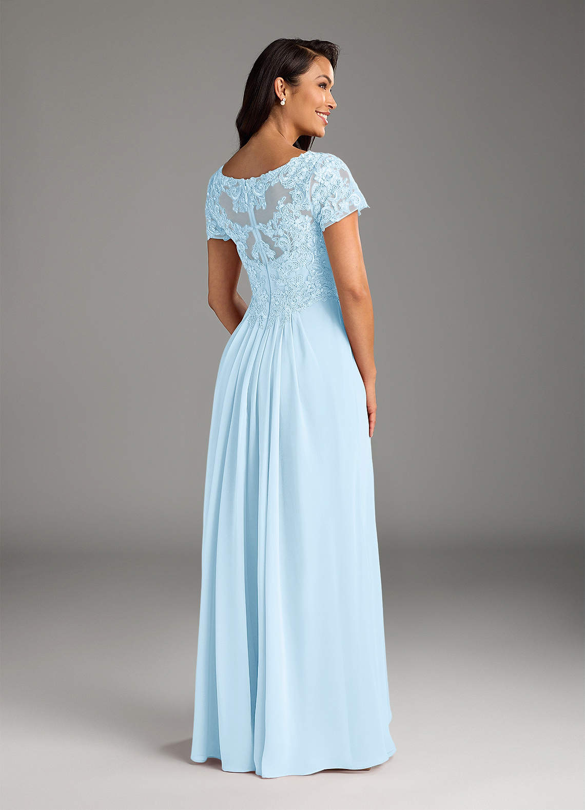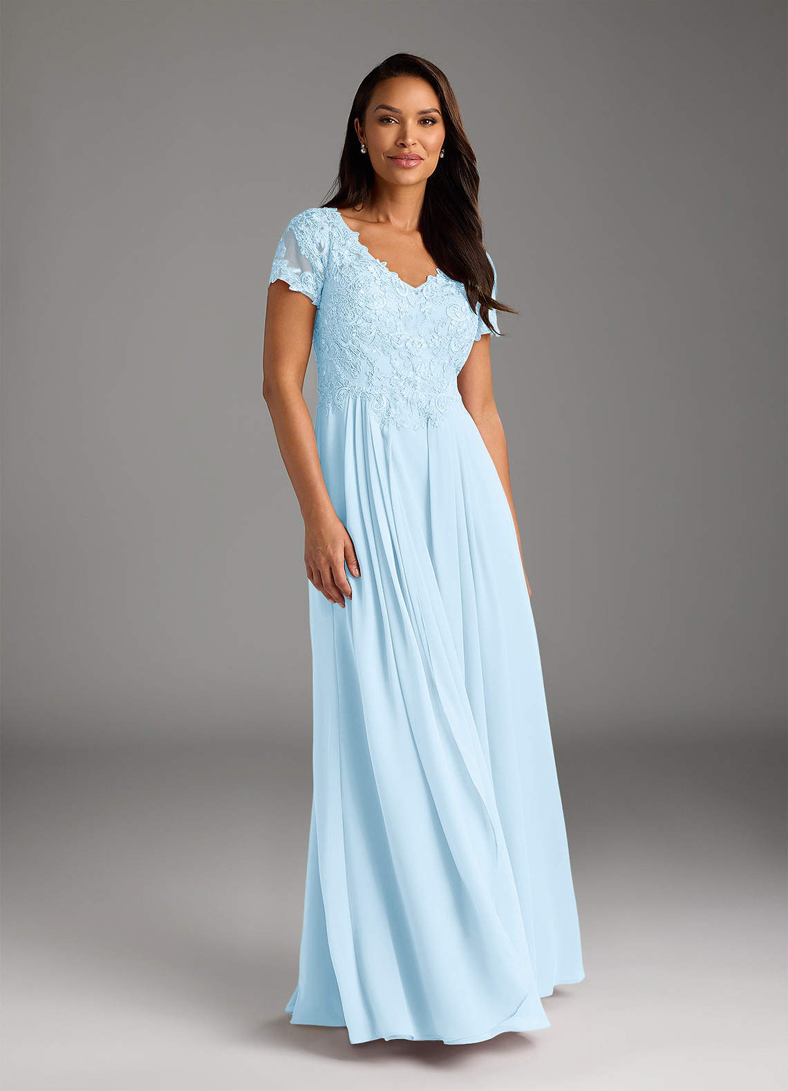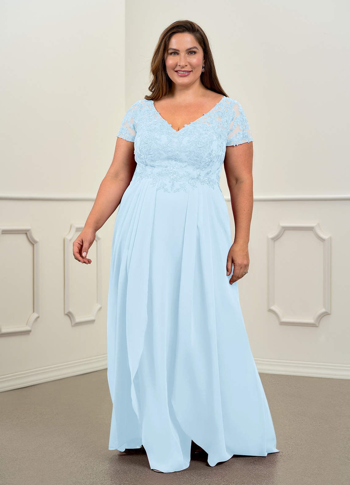Look classic and elegant wearing our Dunja dress. Her bodice features a tulle and corded lace applique bodice with a V-neckline and cap sleeves. Her full A-line skirt cut from chiffon also comes with an open over skirt to add an extra touch of drama.