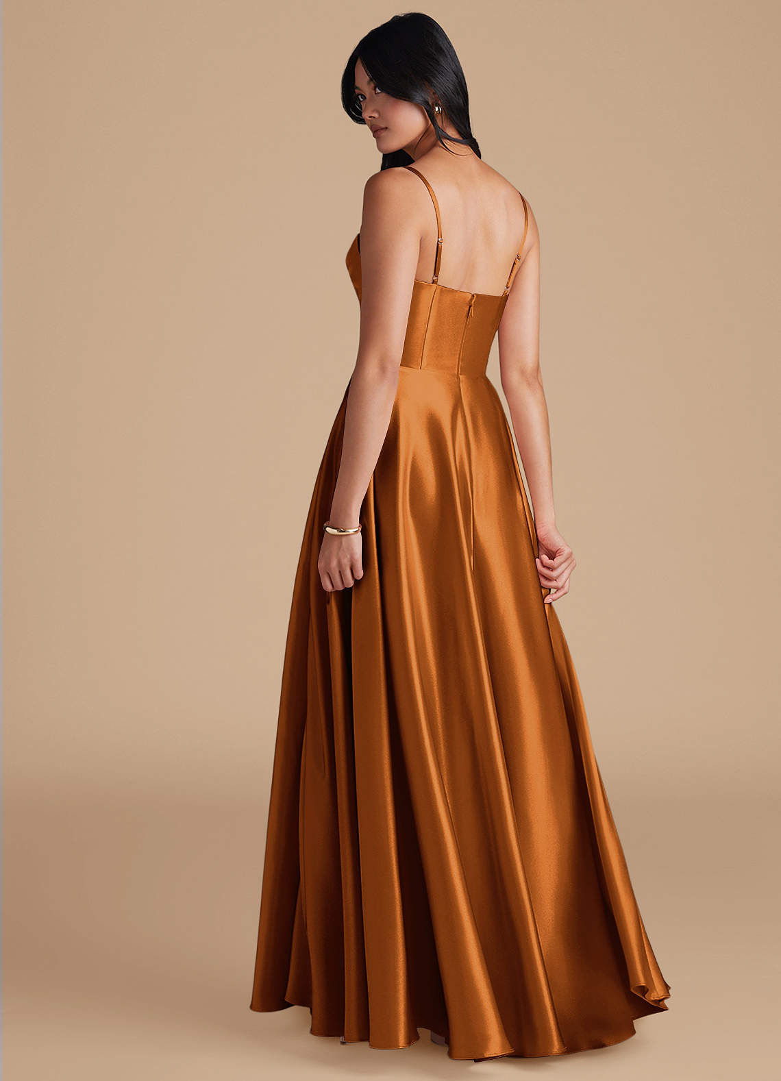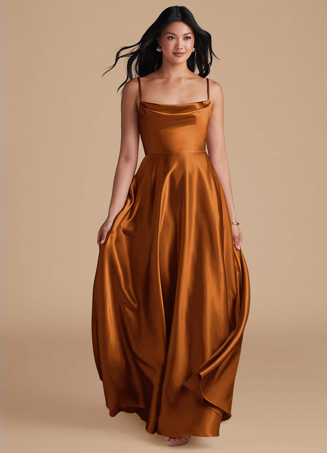 Your bridesmaids will be radiant with beauty while wearing our metallic satin A-line dresses, Elle. Her soft cowl neckline is held by delicate, adjustable spaghetti straps. Her full A-line skirt adds a sense of grandeur, with discreet pockets for practicality and an overlapping leg slit. Perfect blend of elegance and comfort, this dress is both timeless and effortlessly chic.