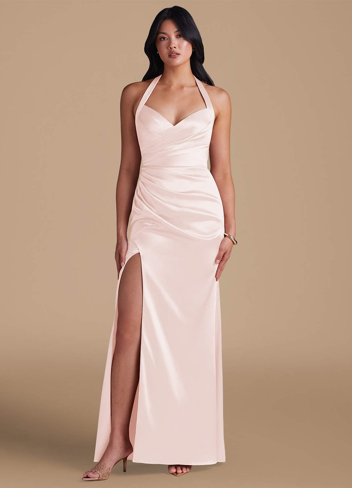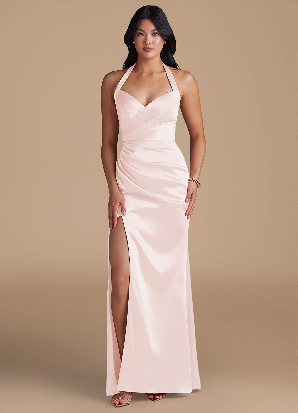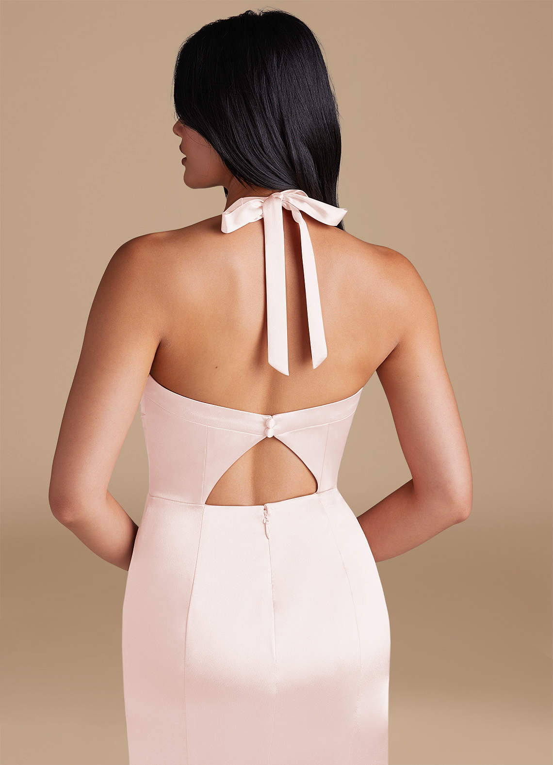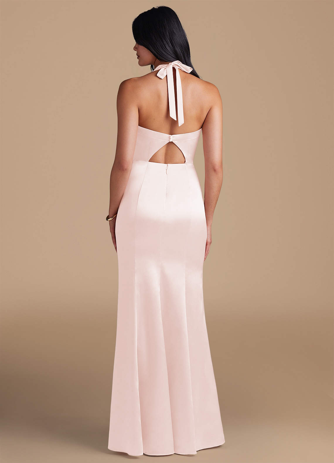 Emeria is perfect for all bridesmaids looking for that snatched look. Cut from metallic satin, her halter V-neckline is held by a bow-tie closure over an open back. The bodice is complimented by a keyhole back with button closure. The waist is snatched with the use of pleating and a mermaid silhouette. The skirt flows beautifully as the leg slit opens with every step.
