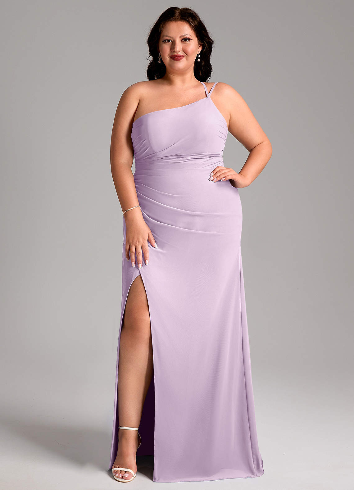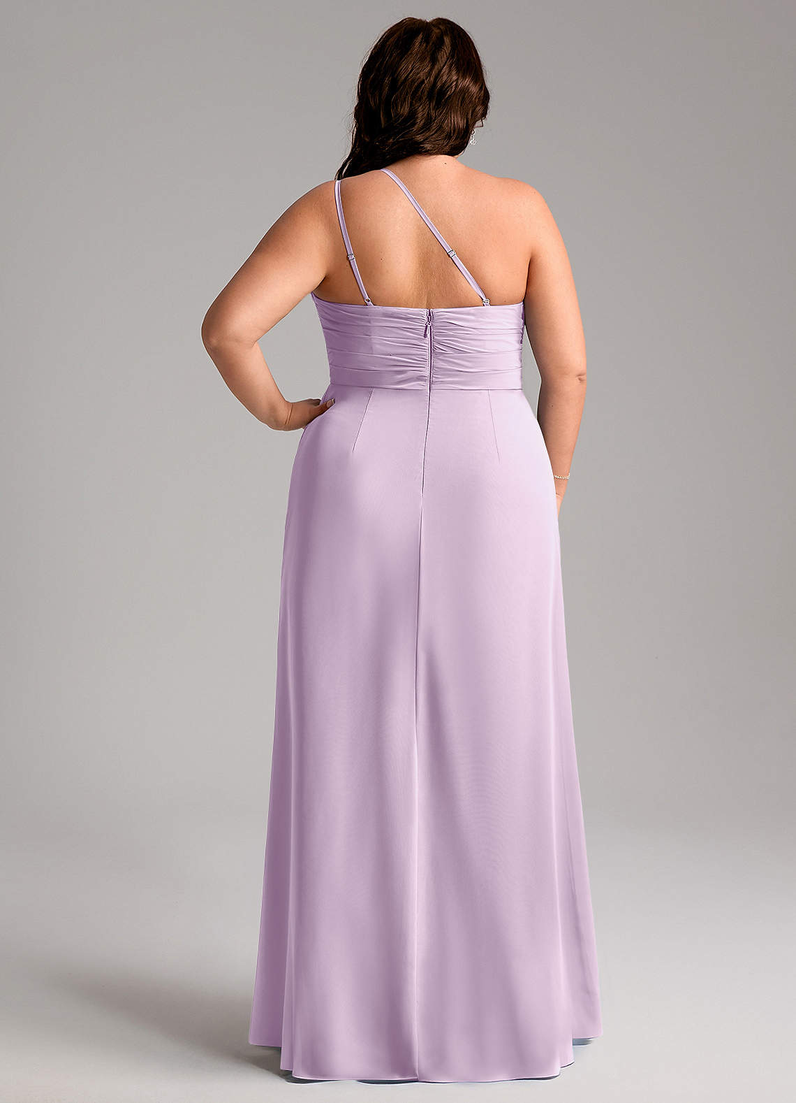 Stun the bridal party in our chiffon bridesmaid dress, Eren. Featuring an asymmetrical neckline, this bridesmaid dress is a one-shoulder style with a double strap detail. Pleating begins at the bodice and runs down onto the sheath skirt silhouette. Her draped pleated skirt overlaps and creates a dramatic leg slit when walking.