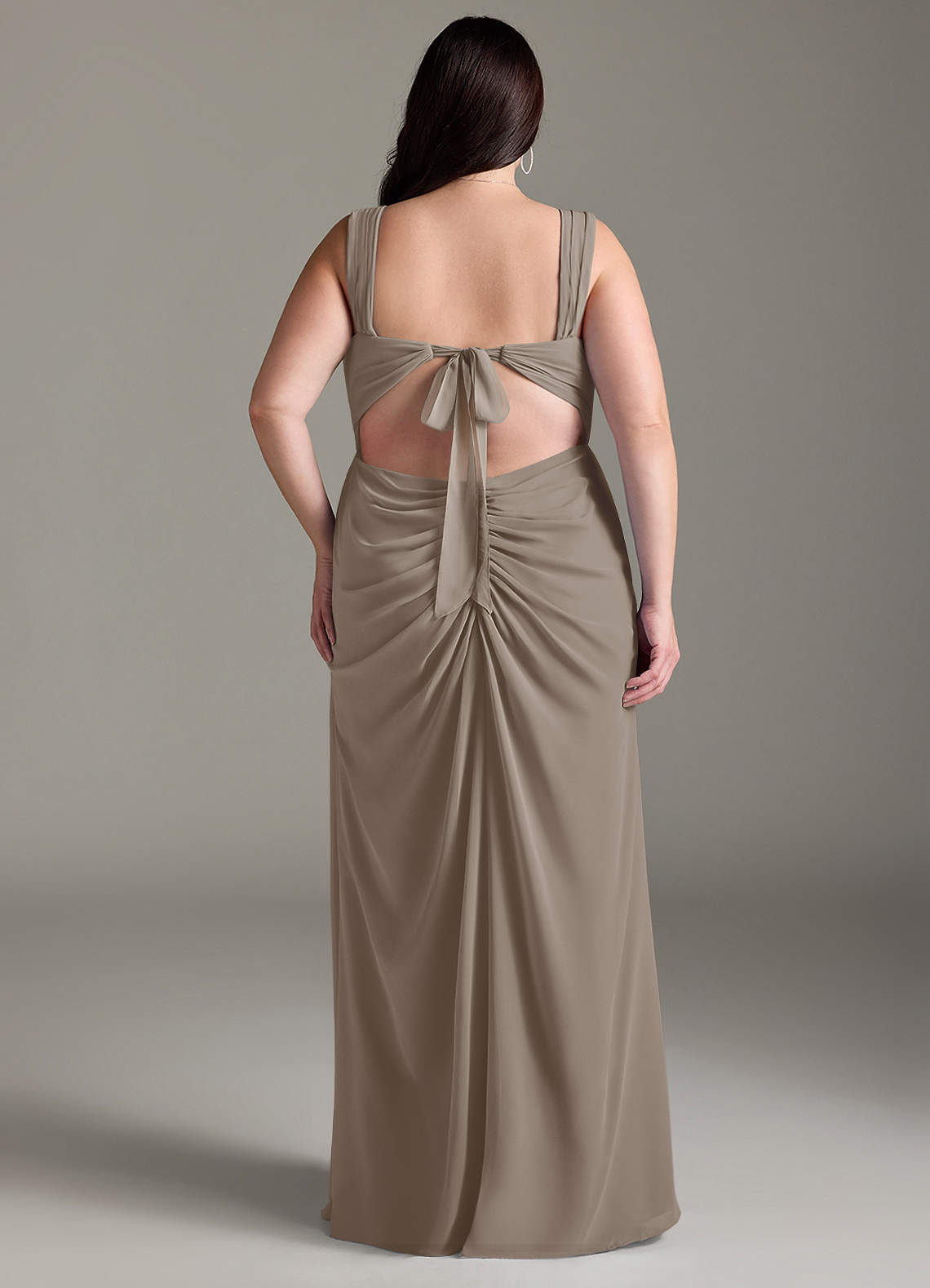 Be there for your best friend's special day in Jesaphine, our chic chiffon bridesmaid dress. She features a straight neckline with a ruched body, ruched shoulder straps, a fashionable keyhole bow tie back, and a leg slit to dance the night away.