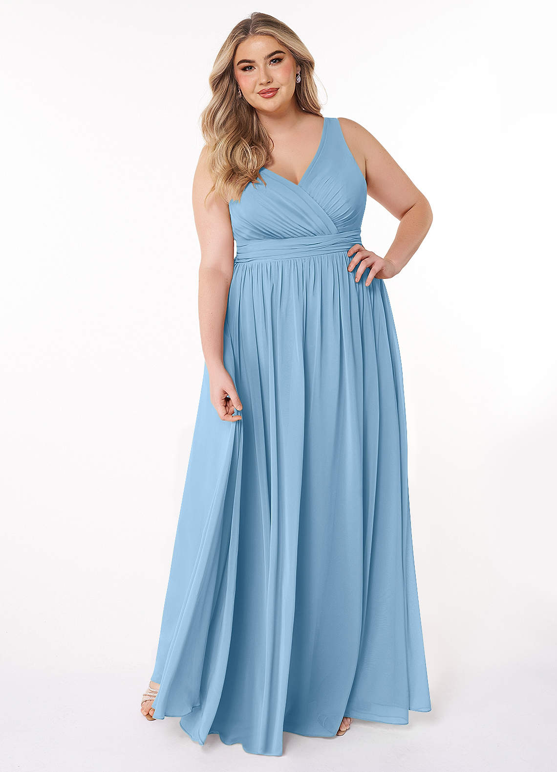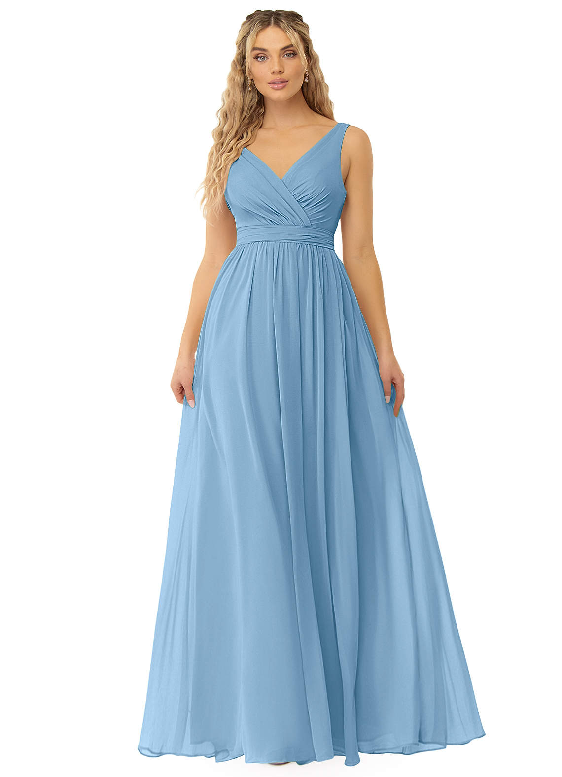 The attractive floor-length bridesmaid dress by Azazie has an A-line/princess cut in a gorgeous chiffon. This bridesmaid dress features a v-neck neckline and comes in a full-size range (A0-A30). A pleated detail at the front and back of the flowing skirt makes it perfect for the reception or a city hall wedding.