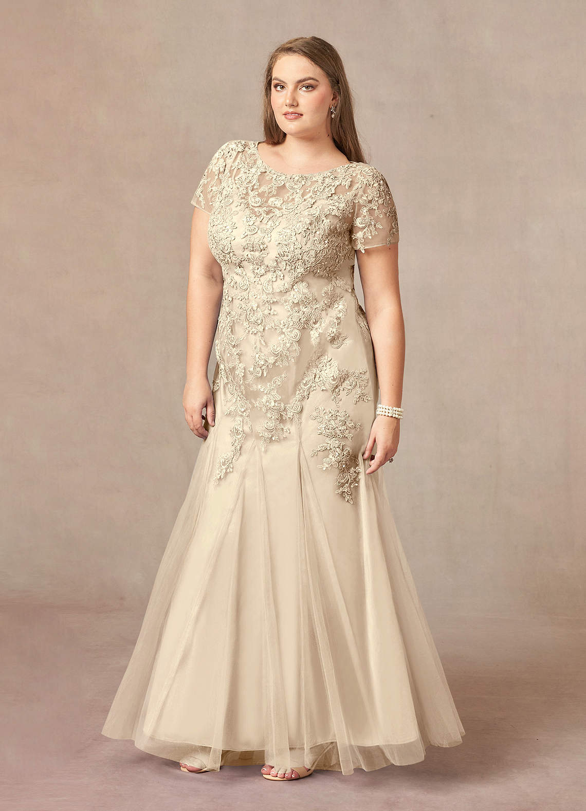 Feel sophisticated and elegant wearing our Laurie tulle gown. Featuring a scoop neckline, she has beautiful corded lace overlay with delicate hand beading shining throughout. Her floor length skirt is cut in a mermaid silhouette with godet accents.