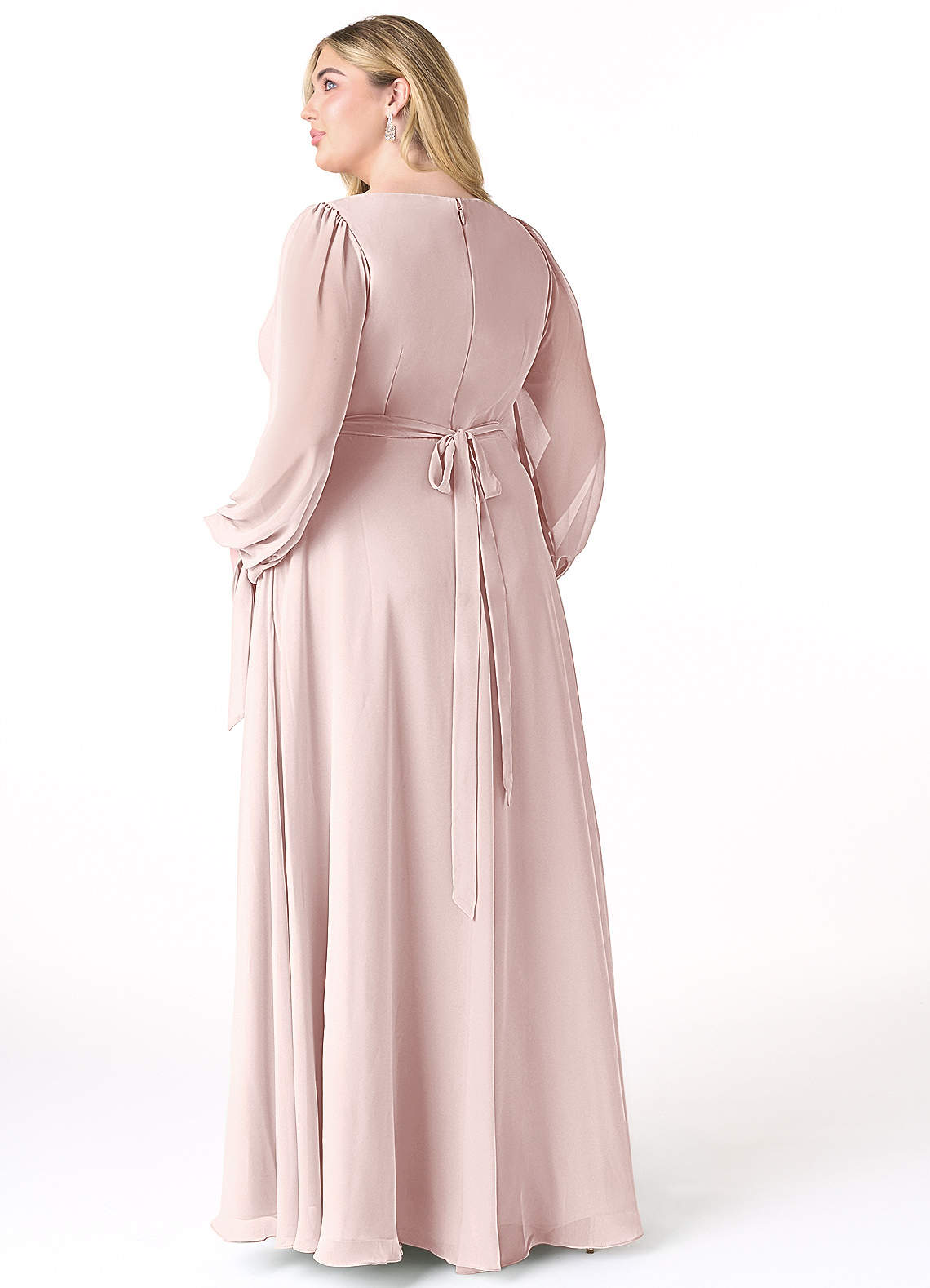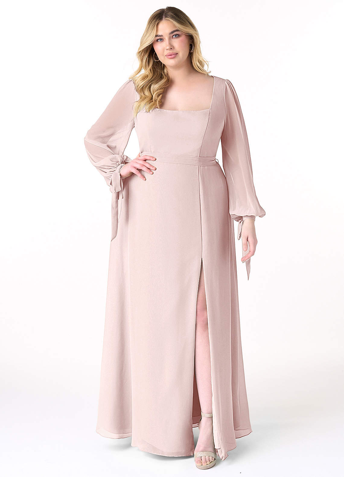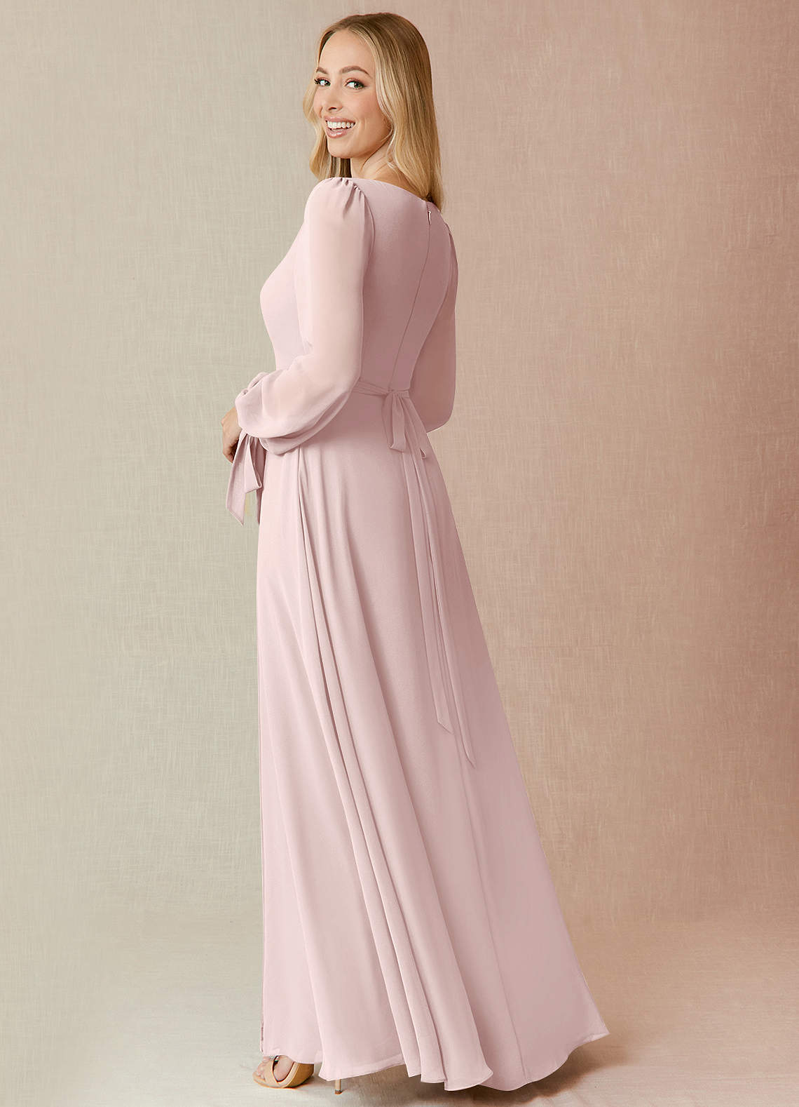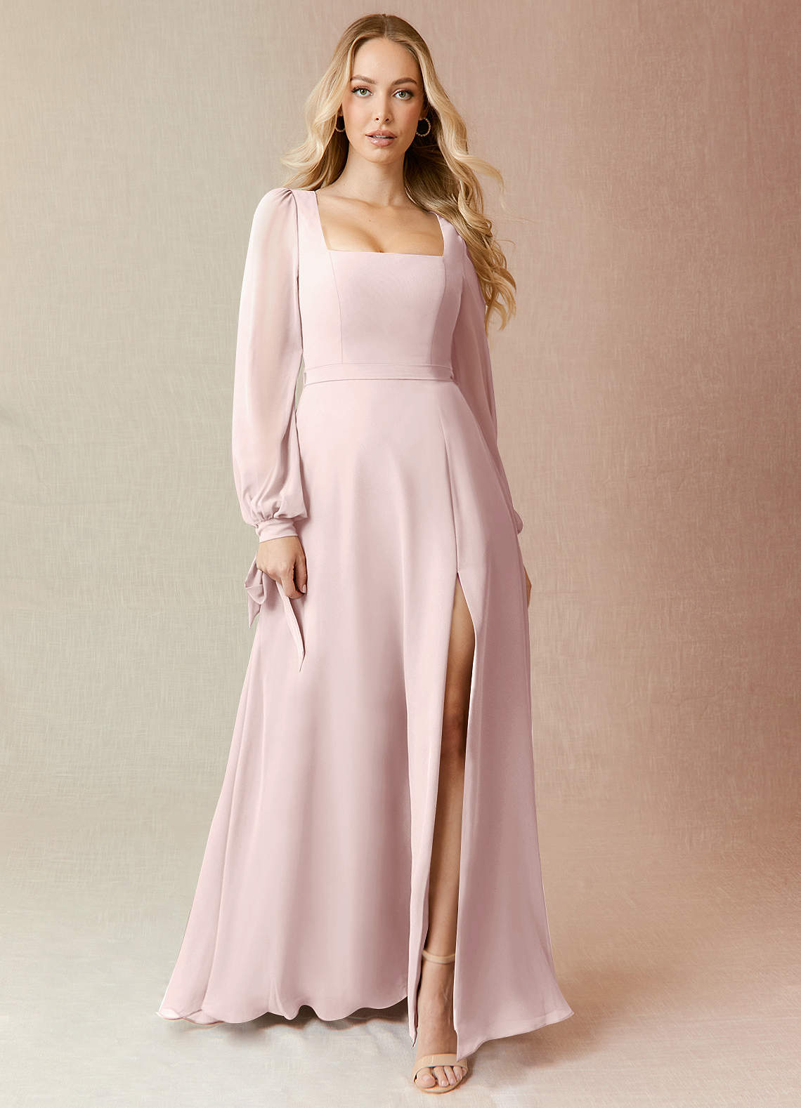 For any girl looking for a modest bridesmaid dress, Leonia is the perfect choice for you. She features a flattering square neckline, beautiful bishop sleeves that tie into a bow around your wrist, a leg slit, and a gorgeous bow that ties around your waist.