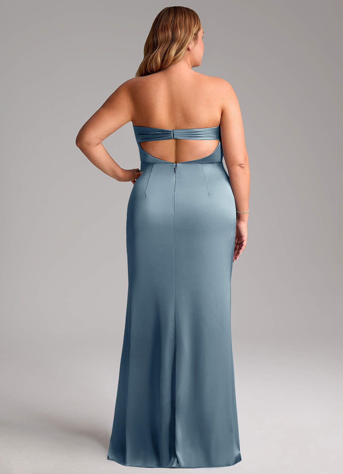 Let your bridesmaids wear our stretch satin mermaid dress, Leonis. Her strapless cowl neckline offers removable straps and a bandeau back over a keyhole detail. The skirt has beautiful pleating details over a front leg slit that opens beautifully with every step.