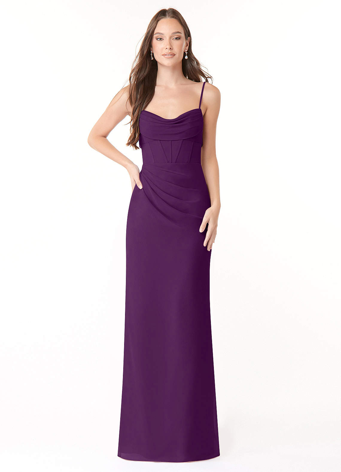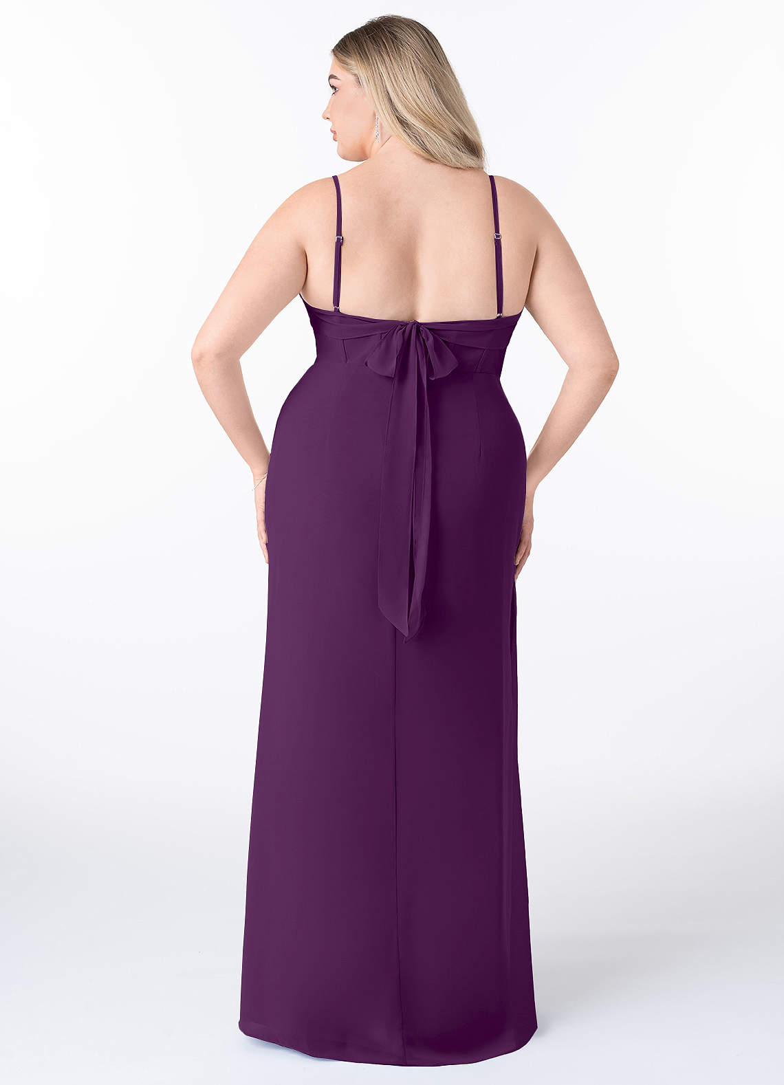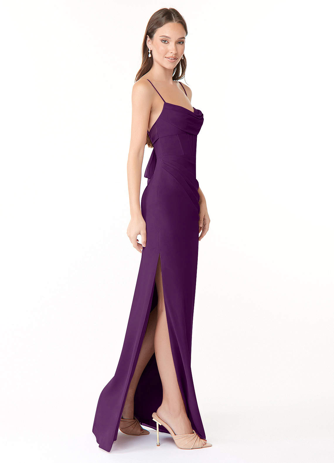Mai is our fashionable and feminine sheath chiffon dress. Her corseted bodice features a flattering pleated cowl neckline, adjustable spaghetti straps, and a beautiful bow tie back. She also has pleats along her skirt with a side leg slit so you can dance the night away in style.