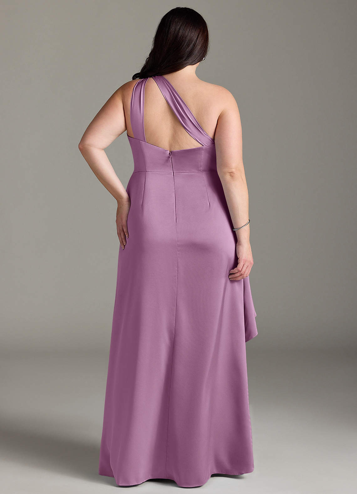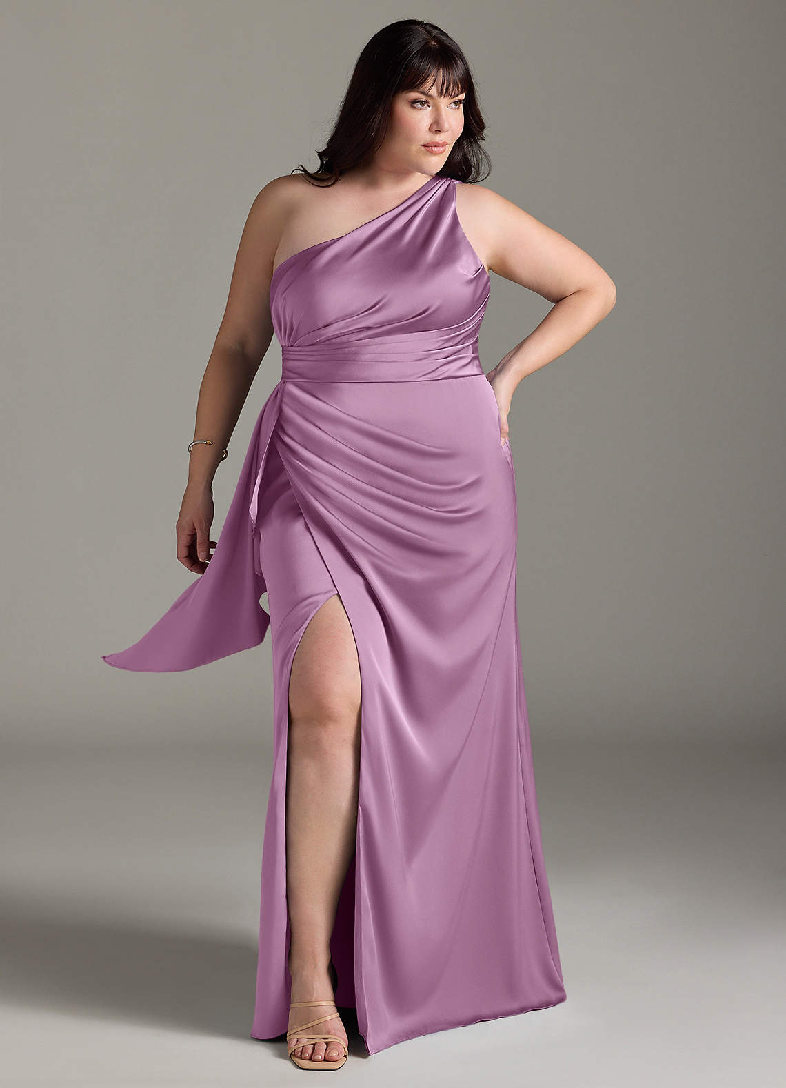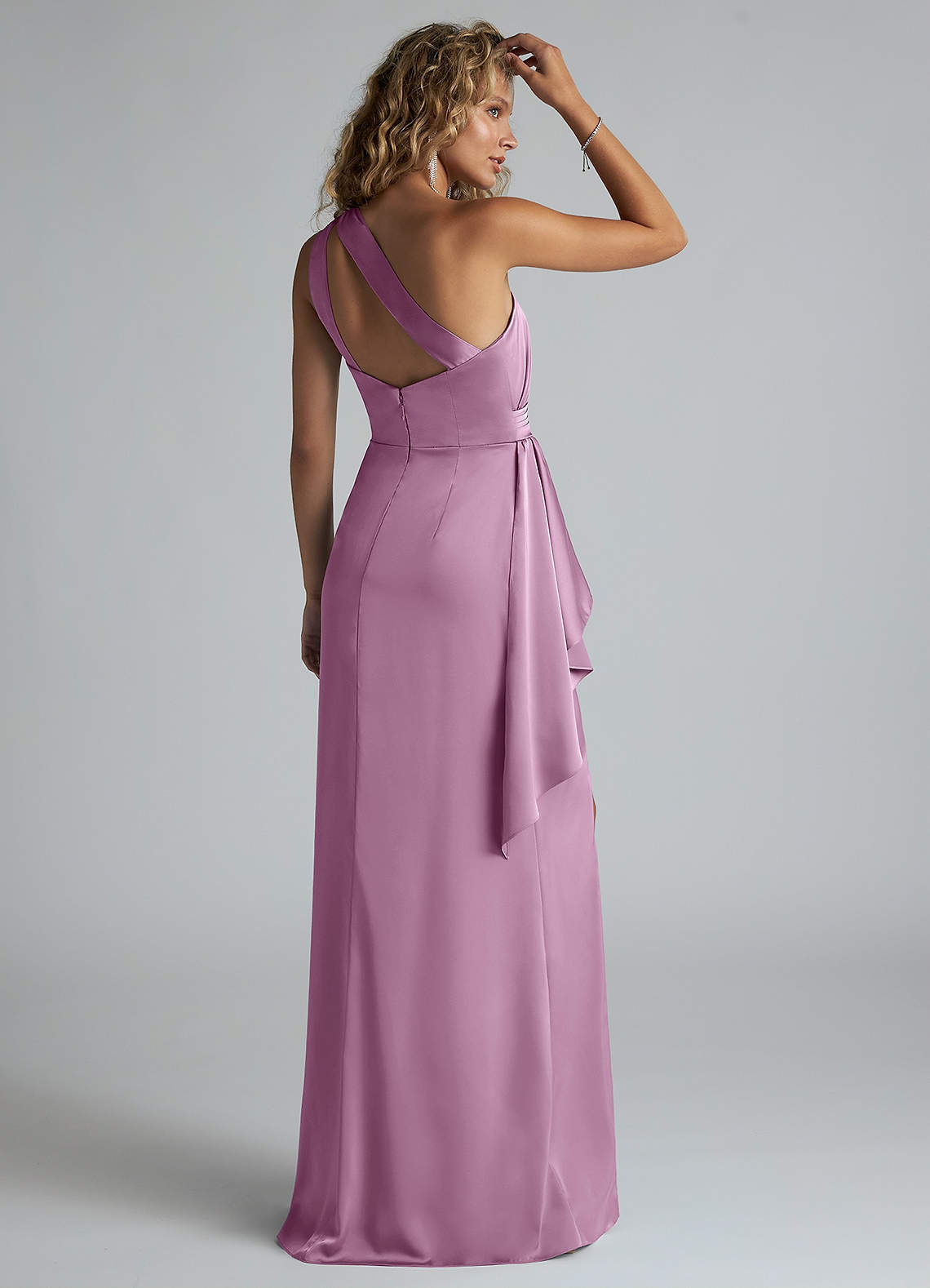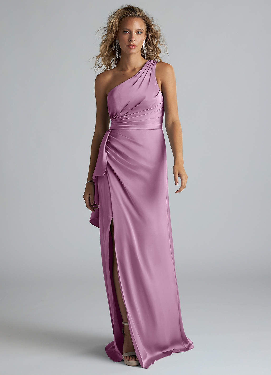 Maive is perfect for any bridesmaid who loves a one-shoulder sheath dress. Her bodice has delicate pleating that is held by two back straps. The pleats cascade onto the skirt and compliment the ruffle side detail and leg slit.