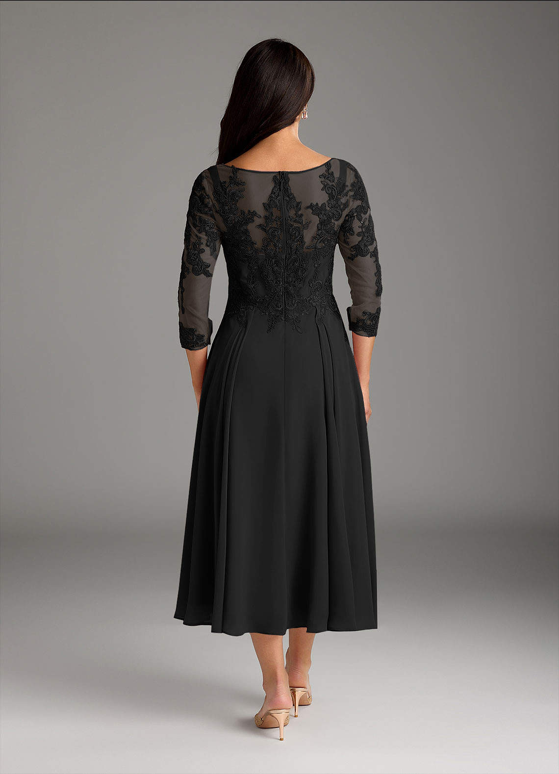 Have fun with family and friends at any event while wearing our chiffon and lace A-line dress, Marge. She has an illusion scoop neckline adorned with hand sewn lace that drapes onto the ¾ sleeves. Her skirt has delicate pleating that allows the skirt to flow with every step.