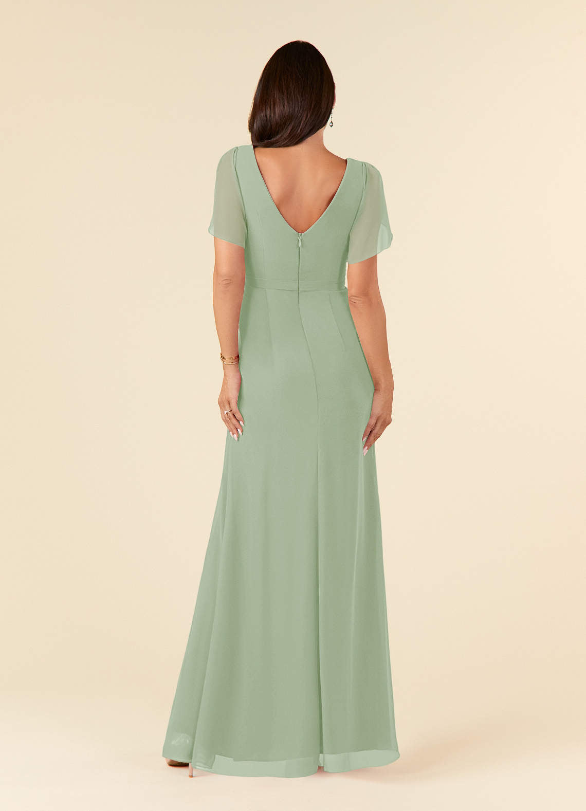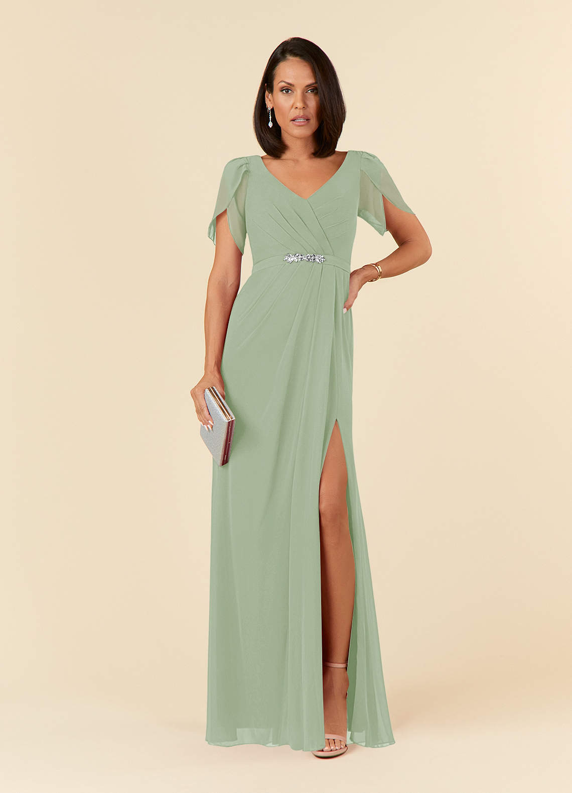 Marianne is our gorgeous gown cut from chiffon. She features a pleated V-neck bodice with tulip sleeves. The look is complete with a pleated floor-length sheath skirt.