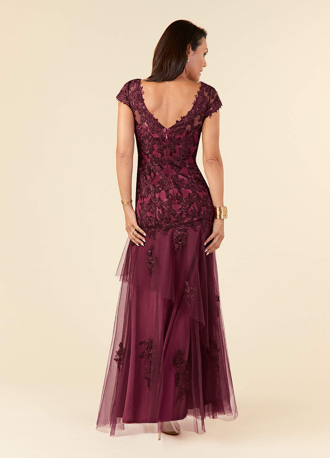Get complimented by friends and family wearing our tulle and lace mermaid gown, Romy. She has V-necklines that are complemented by cap sleeves and embellished with hand sewn lace. Her floor length skirt is cut in a mermaid silhouette with cascading tulle and lace accents.