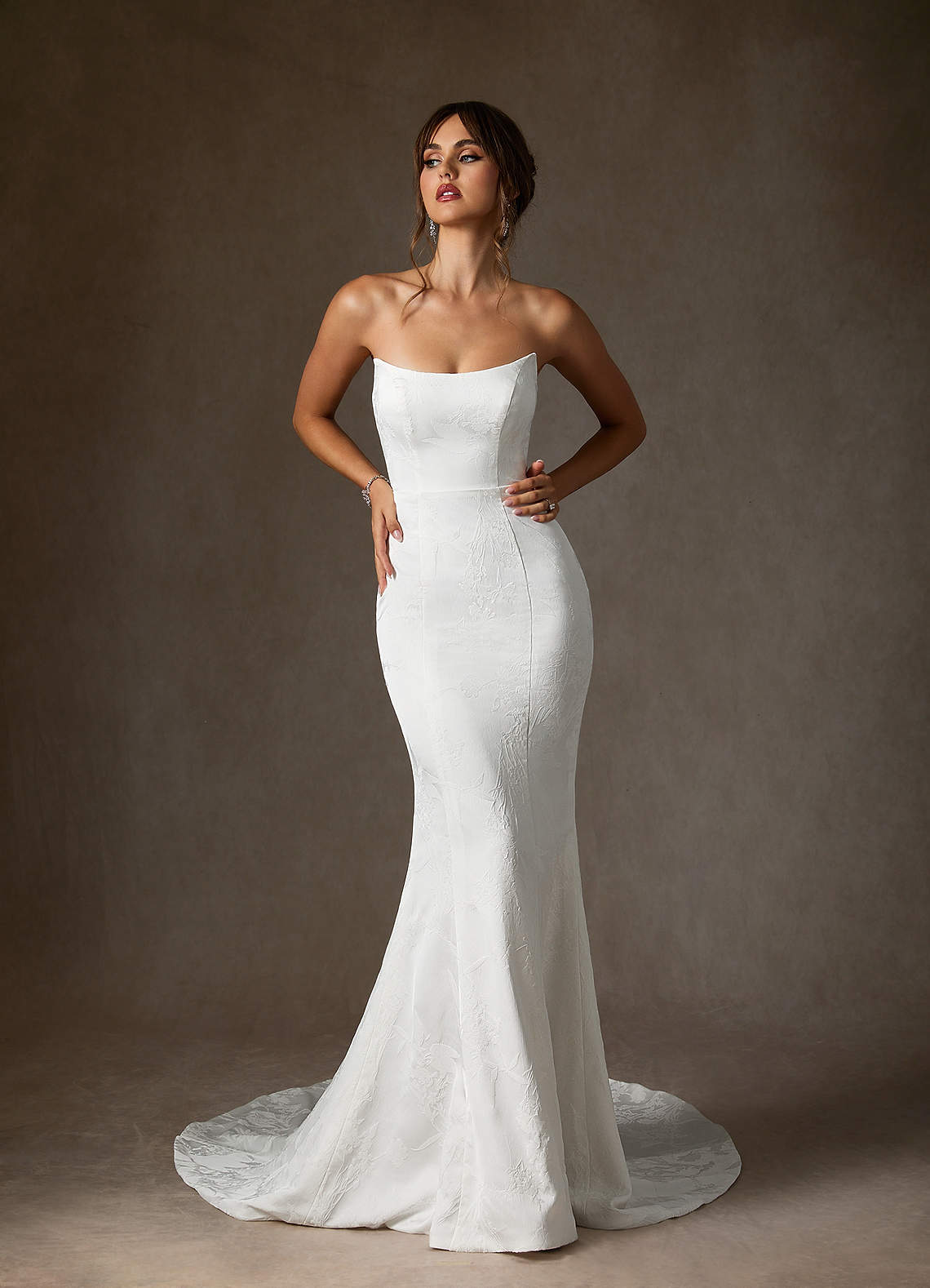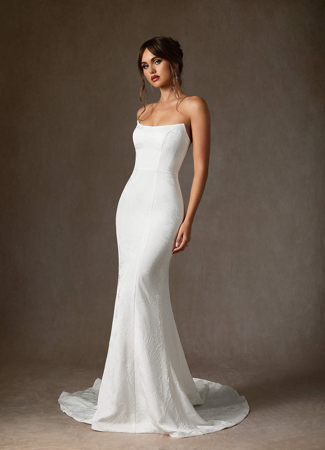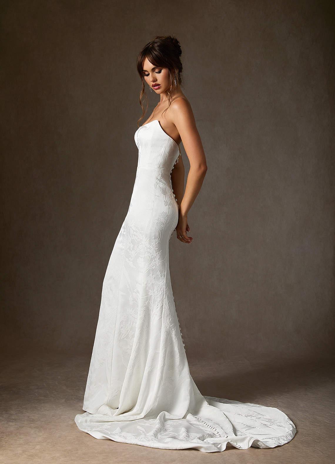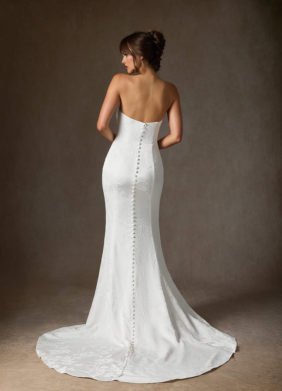 The Seraphina is a feminine mermaid style designed from a floral jacquard, combining a scoop neckline, self-cover back buttons, and a chapel-length train. Feel elegant, romantic and modern, wearing the Seraphina style on your special day.