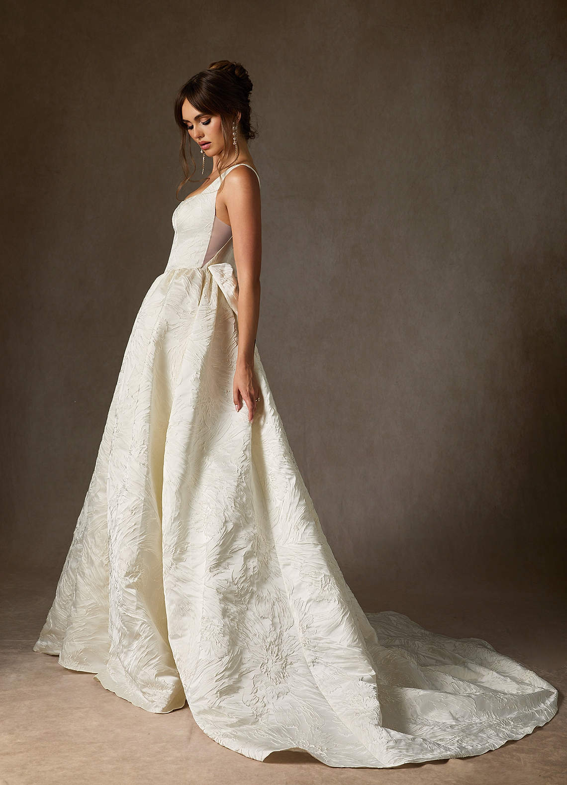 Be the center of attention on your special day in this stunning floral jacquard ball gown. It combines a scoop neckline, a basque waist, a playful removable back bow, and a chapel-length train.